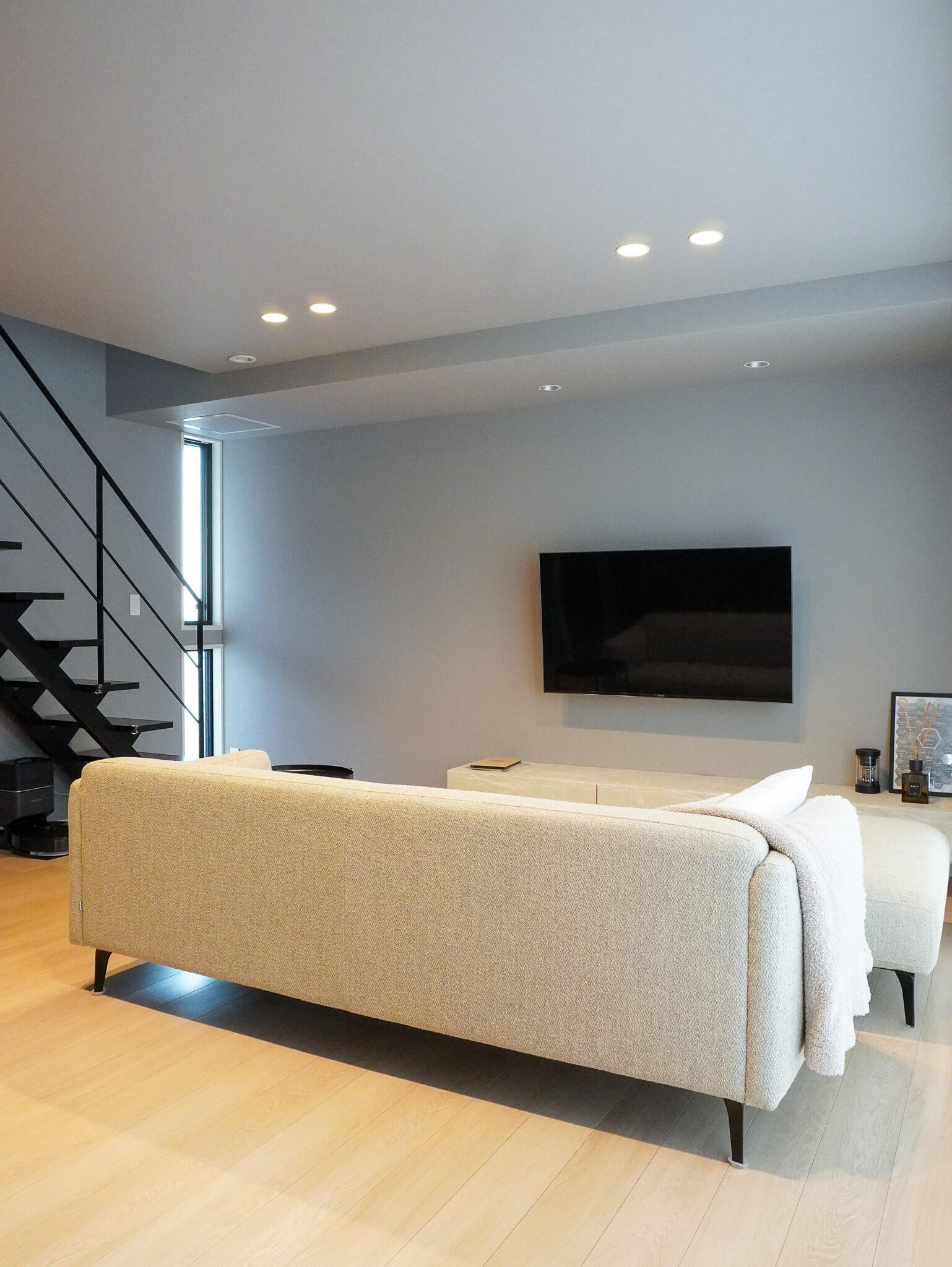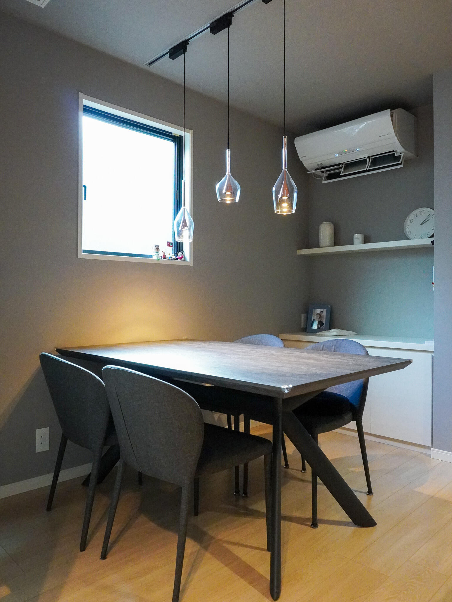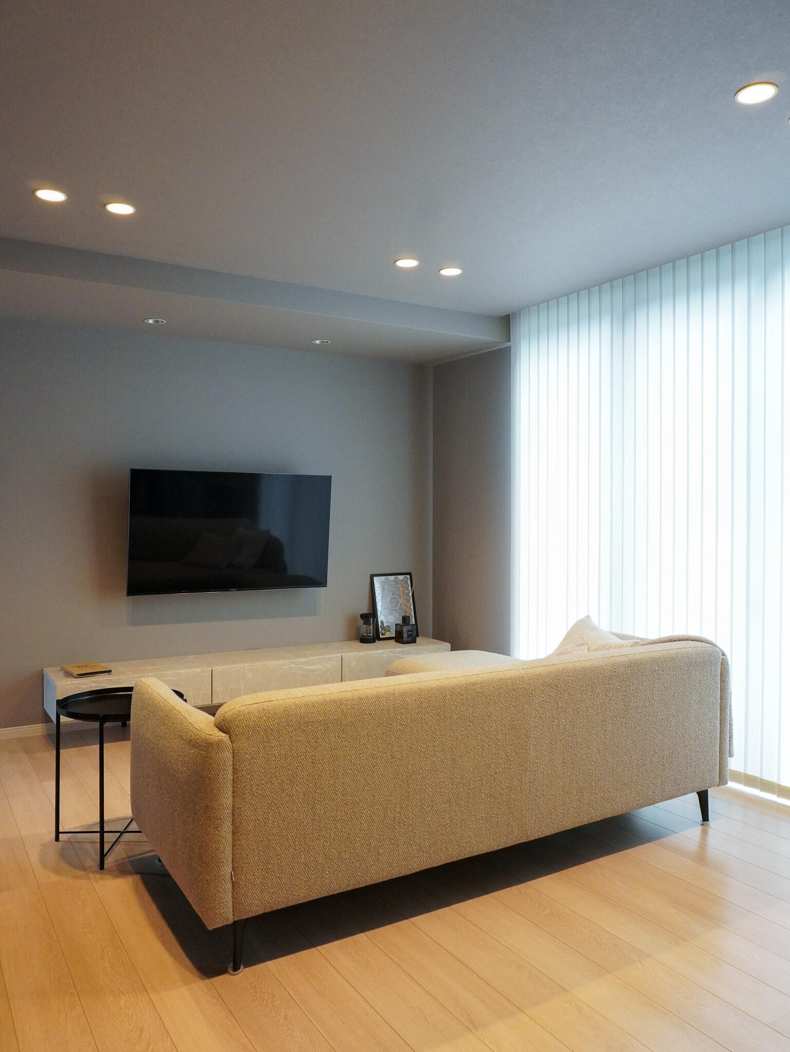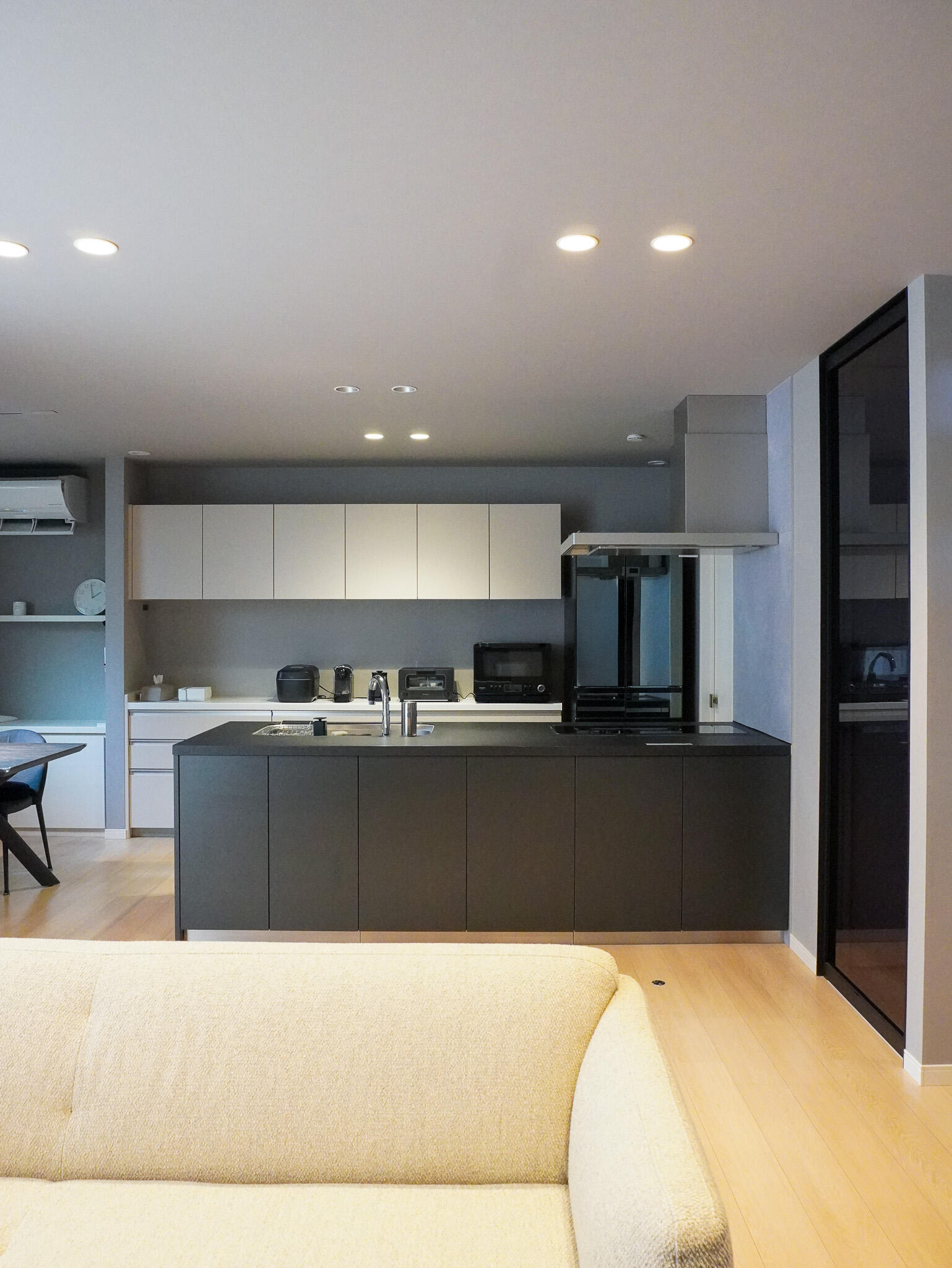 グレー×ブラックを基調にしつつ、間接照明やアート、ガラスの光がアクセントに。