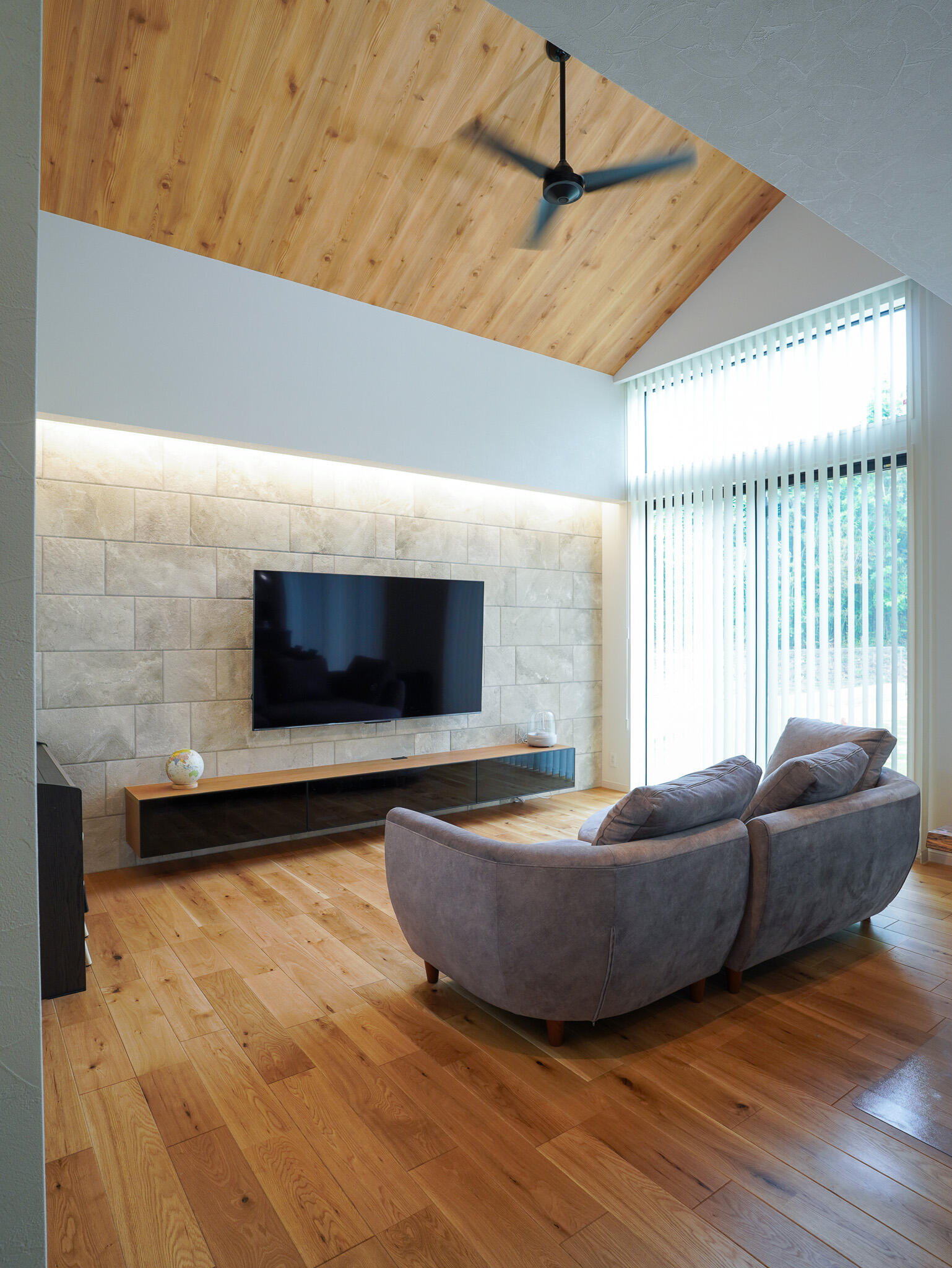 外壁タイルを外装からTVの背面まで採用することで