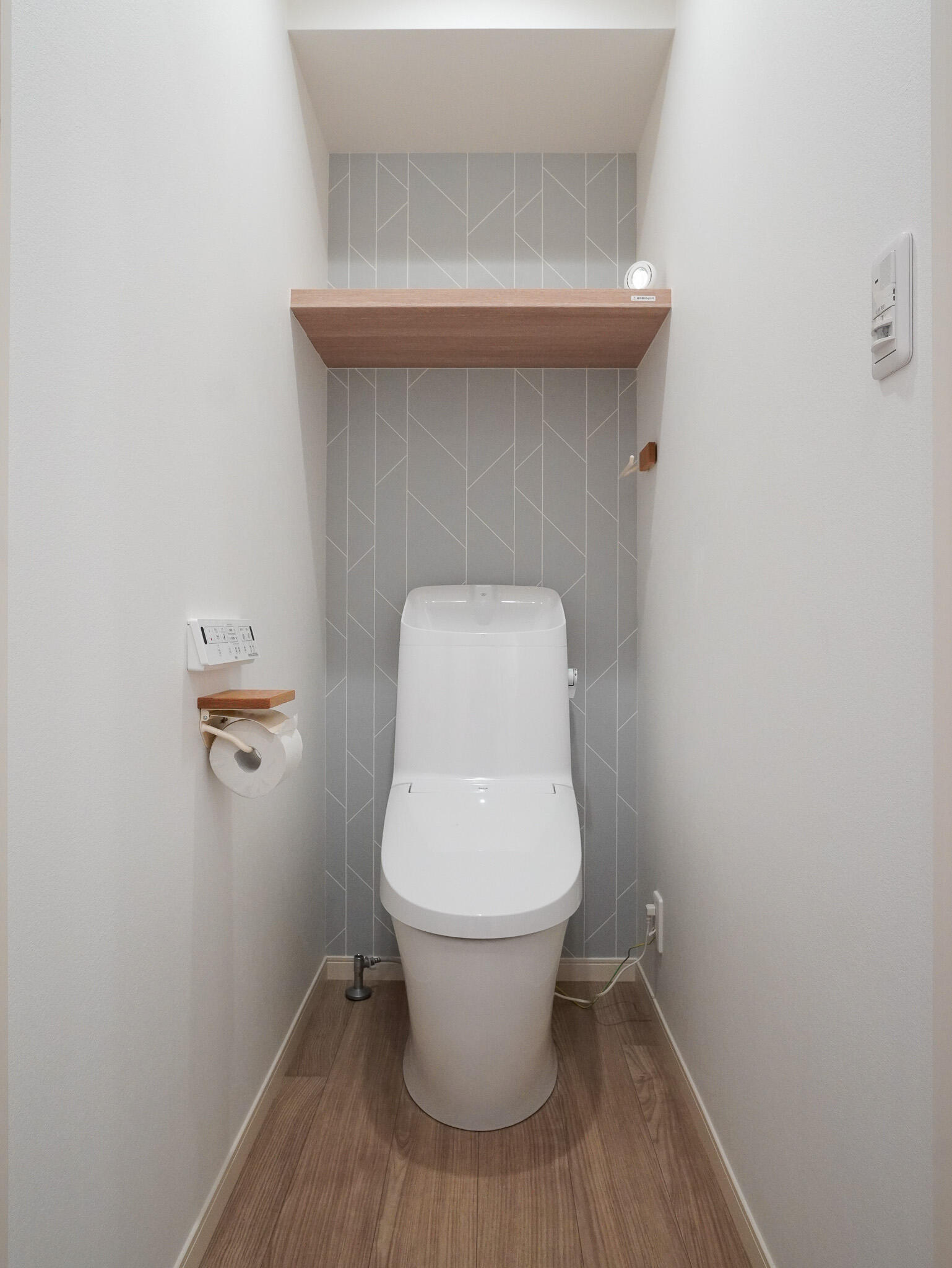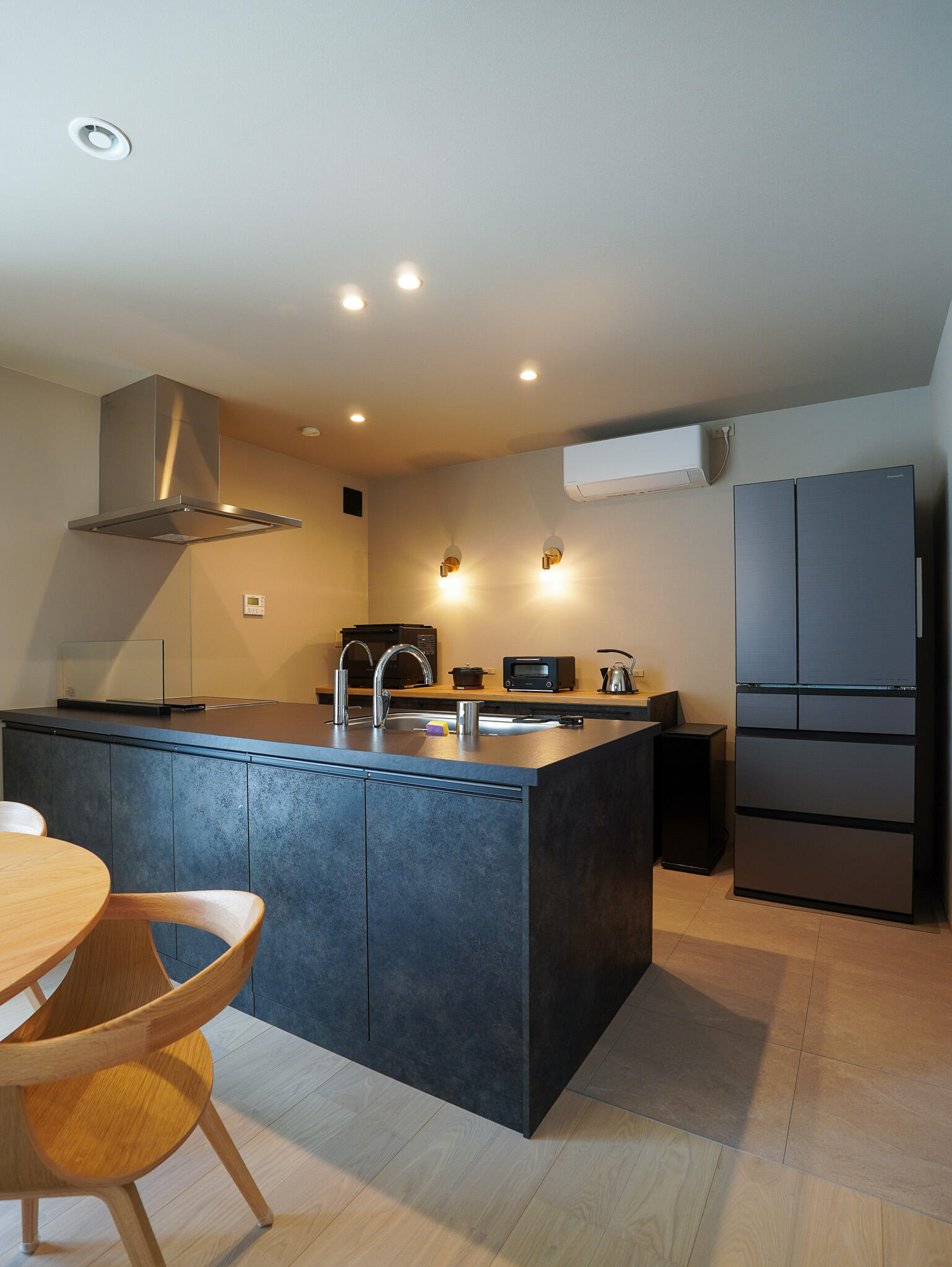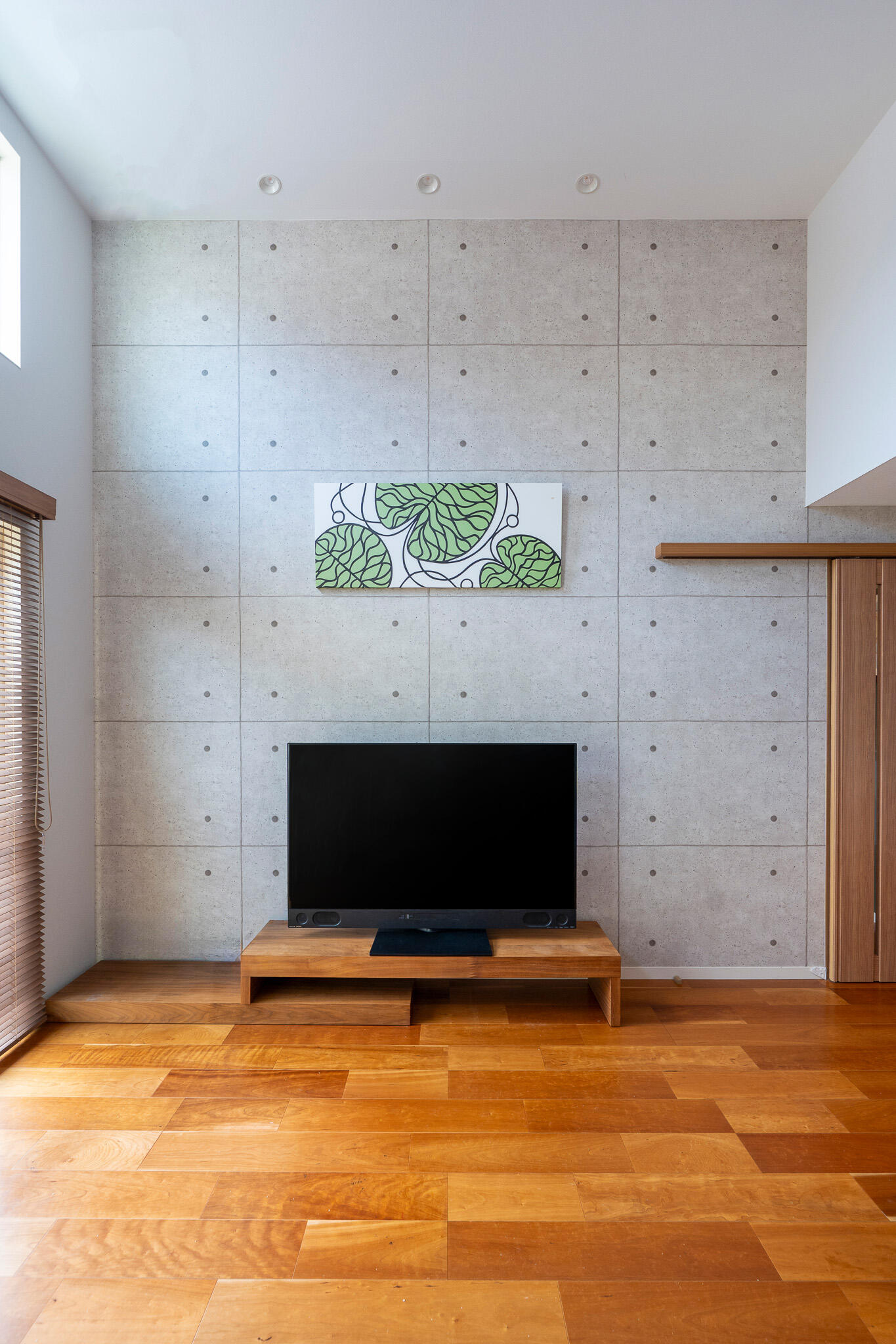 コンクリート風の壁紙と木目のコントラストが、ナチュラルな雰囲気を生み出しています。