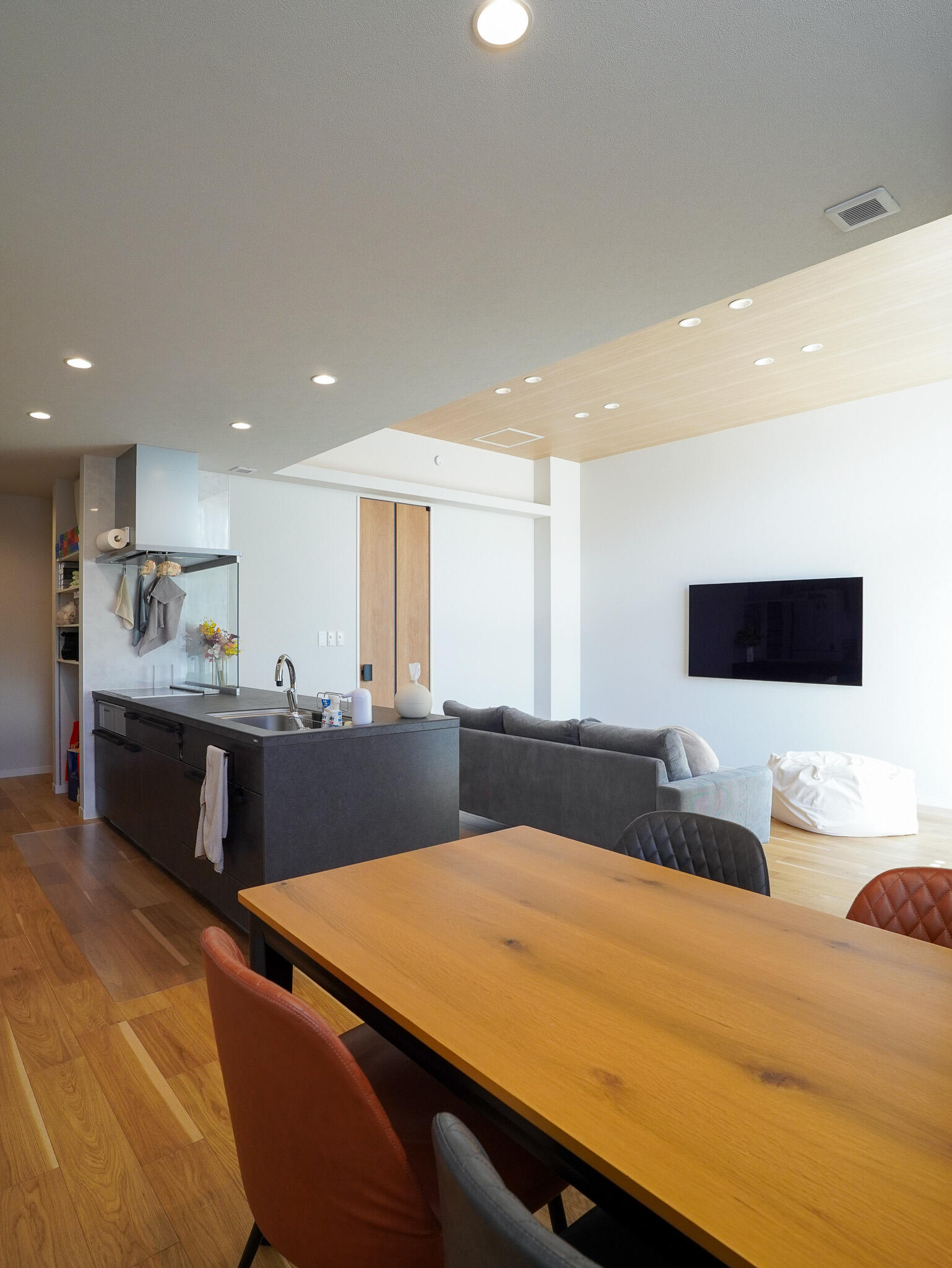光が優しく降り注ぐLDK。 高天井ならではの圧倒的な開放感と、インテリアの色味を統一したことで生まれる洗練された空気感が、日々の暮らしに上質さを添えてくれます。 デザイン性はもちろん、日々の忙しさを支えるスムーズな家事動線も計算し尽くされた設計。 光に満たされながら、家族が自然と集まりたくなるお住まいです。