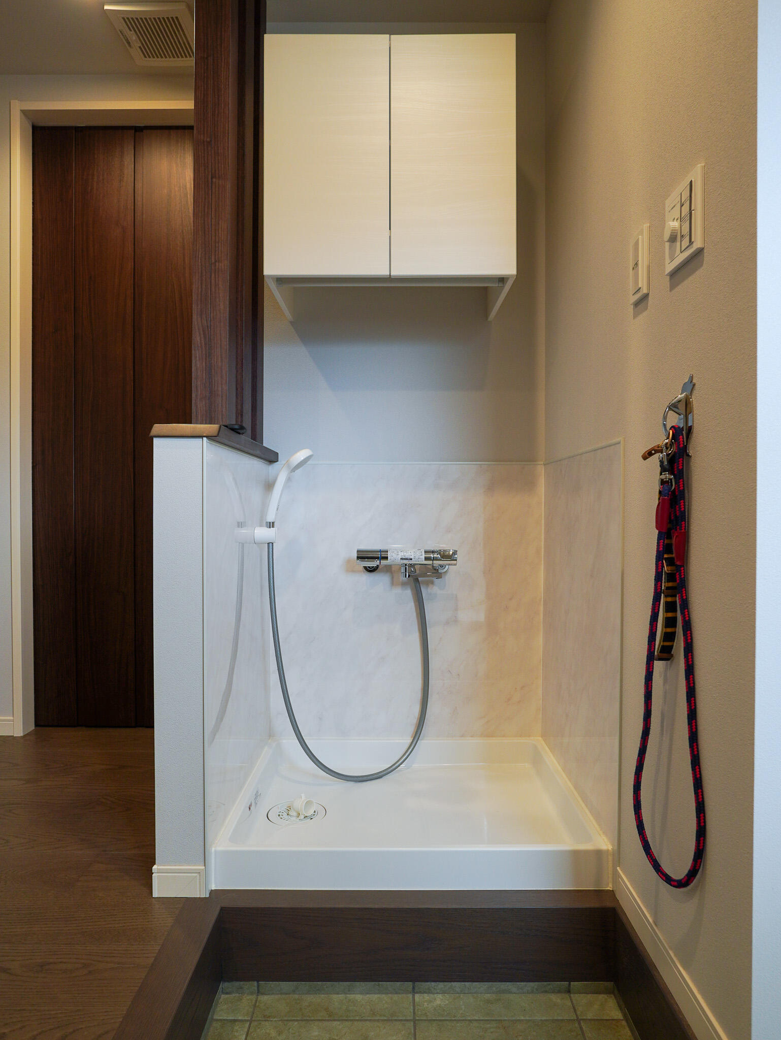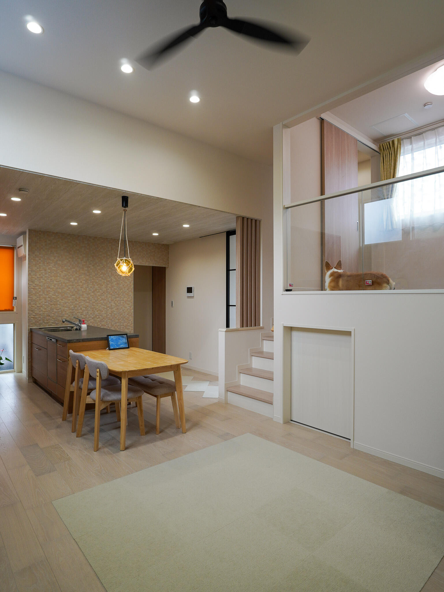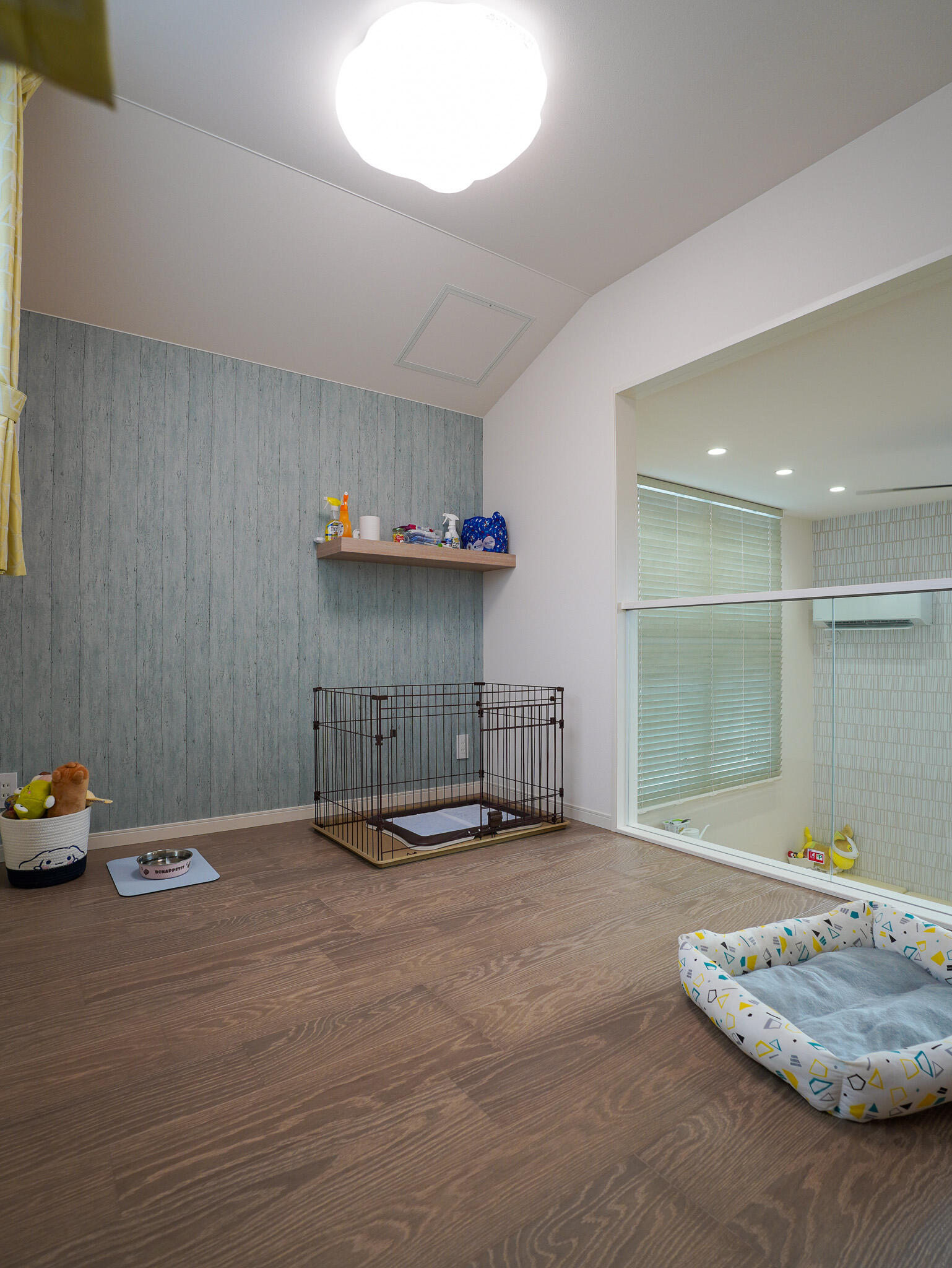 玄関にはペット専用の洗い場を設け、お散歩帰りもスッキリお部屋に。ガラス越しに見守れる愛犬専用スペースは、リビングやキッチンとも緩やかにつながり、家族の気配を感じながら、わんちゃんものびのびと過ごせる住まいです。