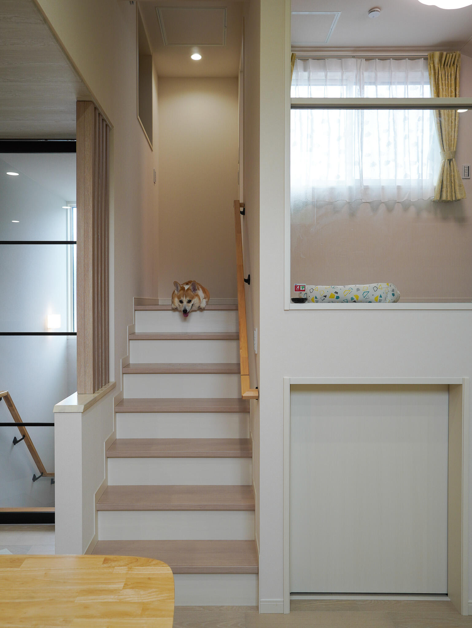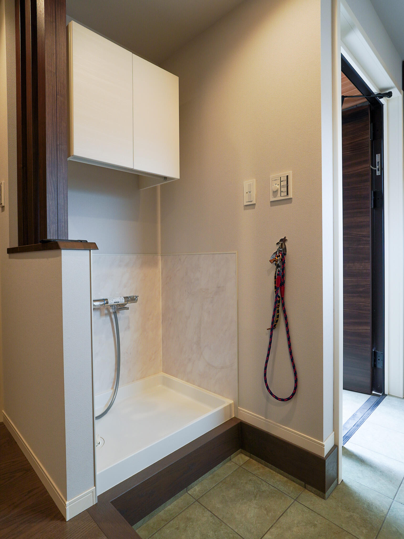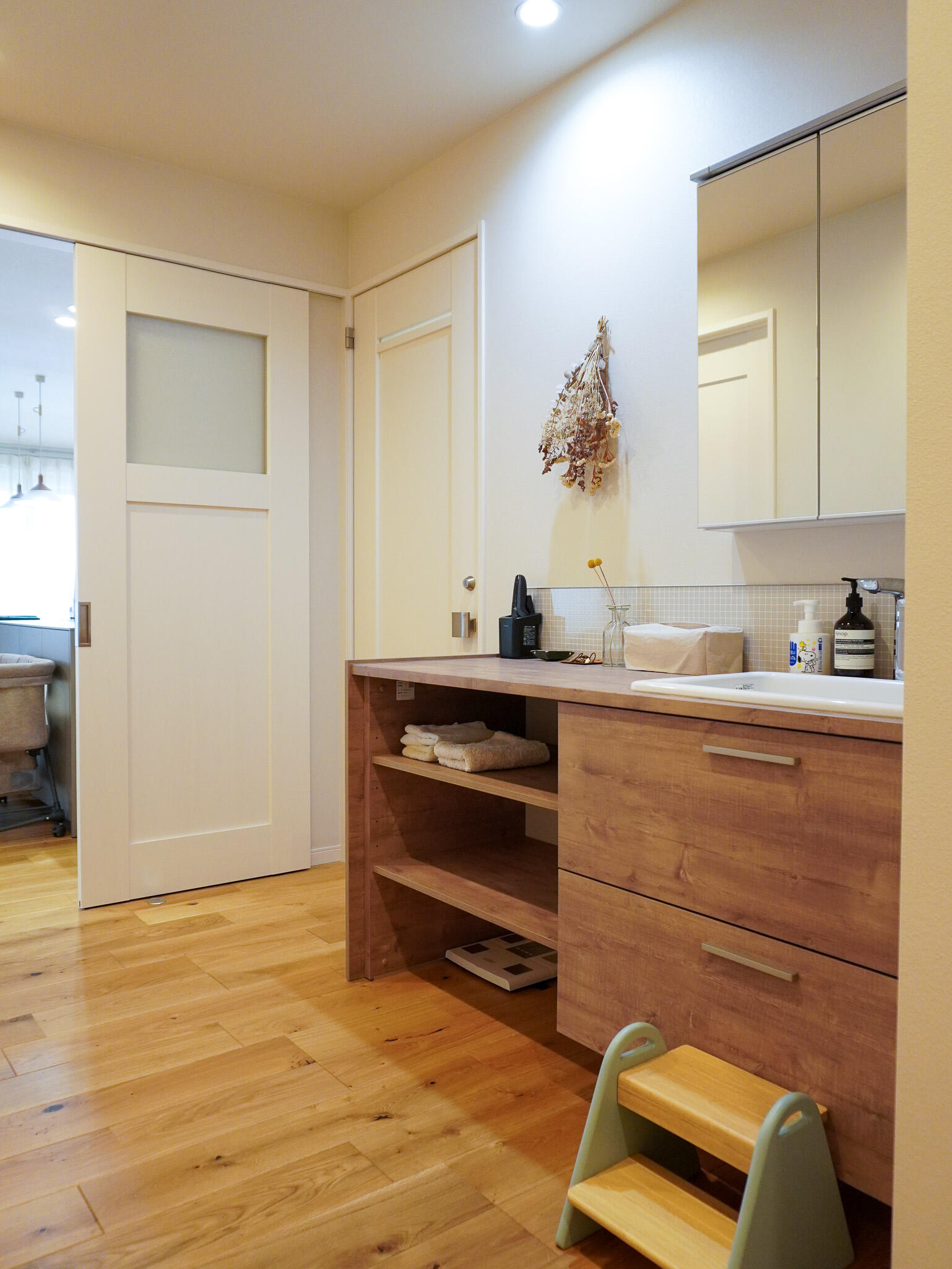 玄関にはペット専用の洗い場を設け、お散歩帰りもスッキリお部屋に。ガラス越しに見守れる愛犬専用スペースは、リビングやキッチンとも緩やかにつながり、家族の気配を感じながら、わんちゃんものびのびと過ごせる住まいです。