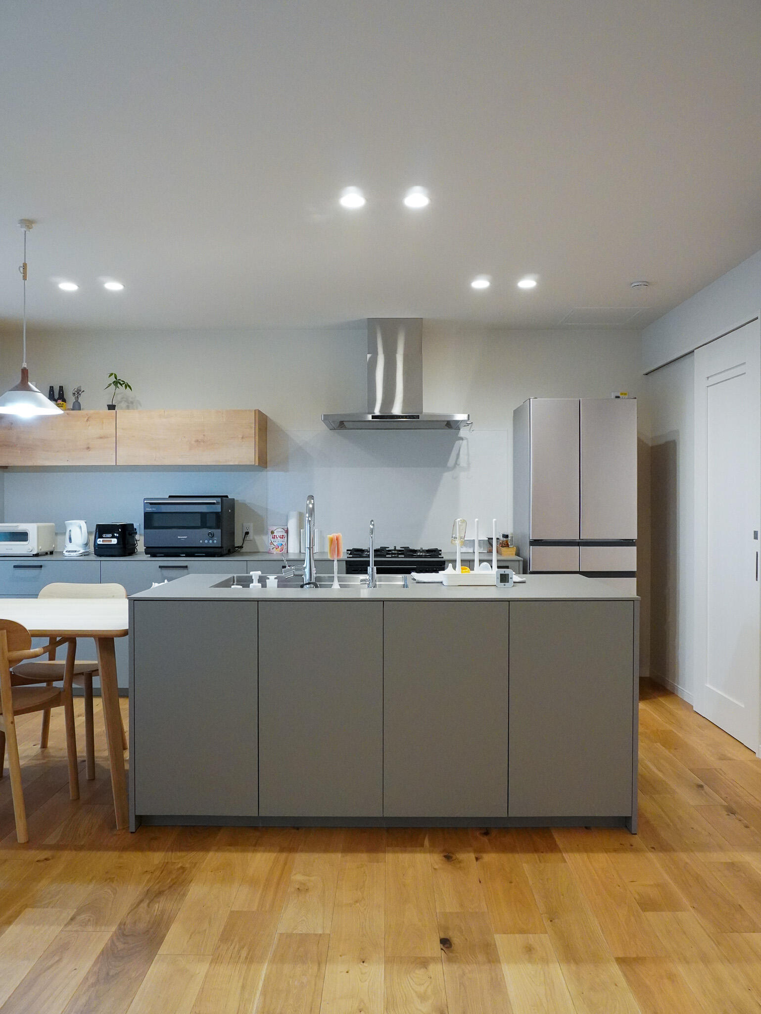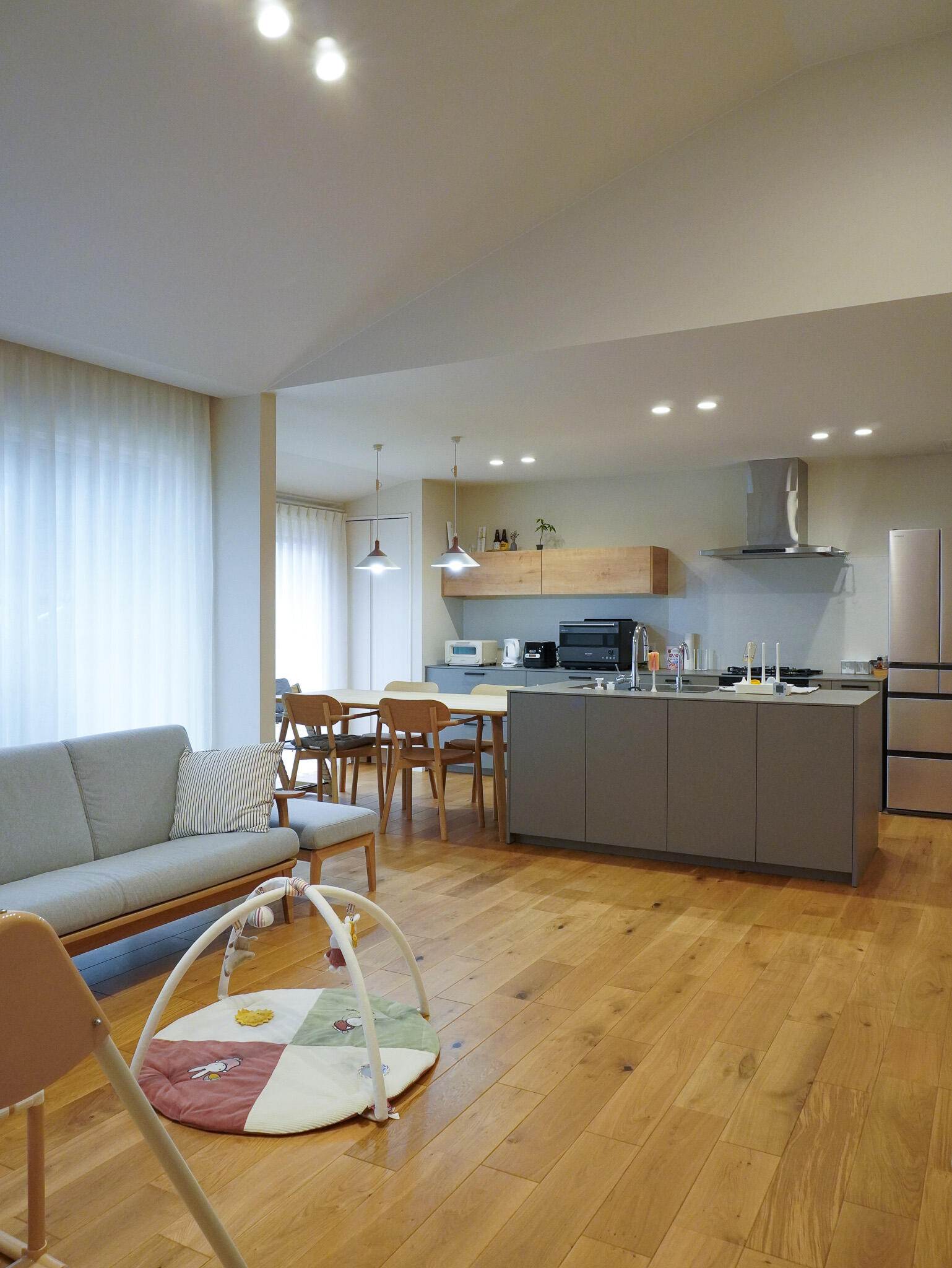 オリーブグレーのキッチンがアクセントの、明るく優しいLDK。