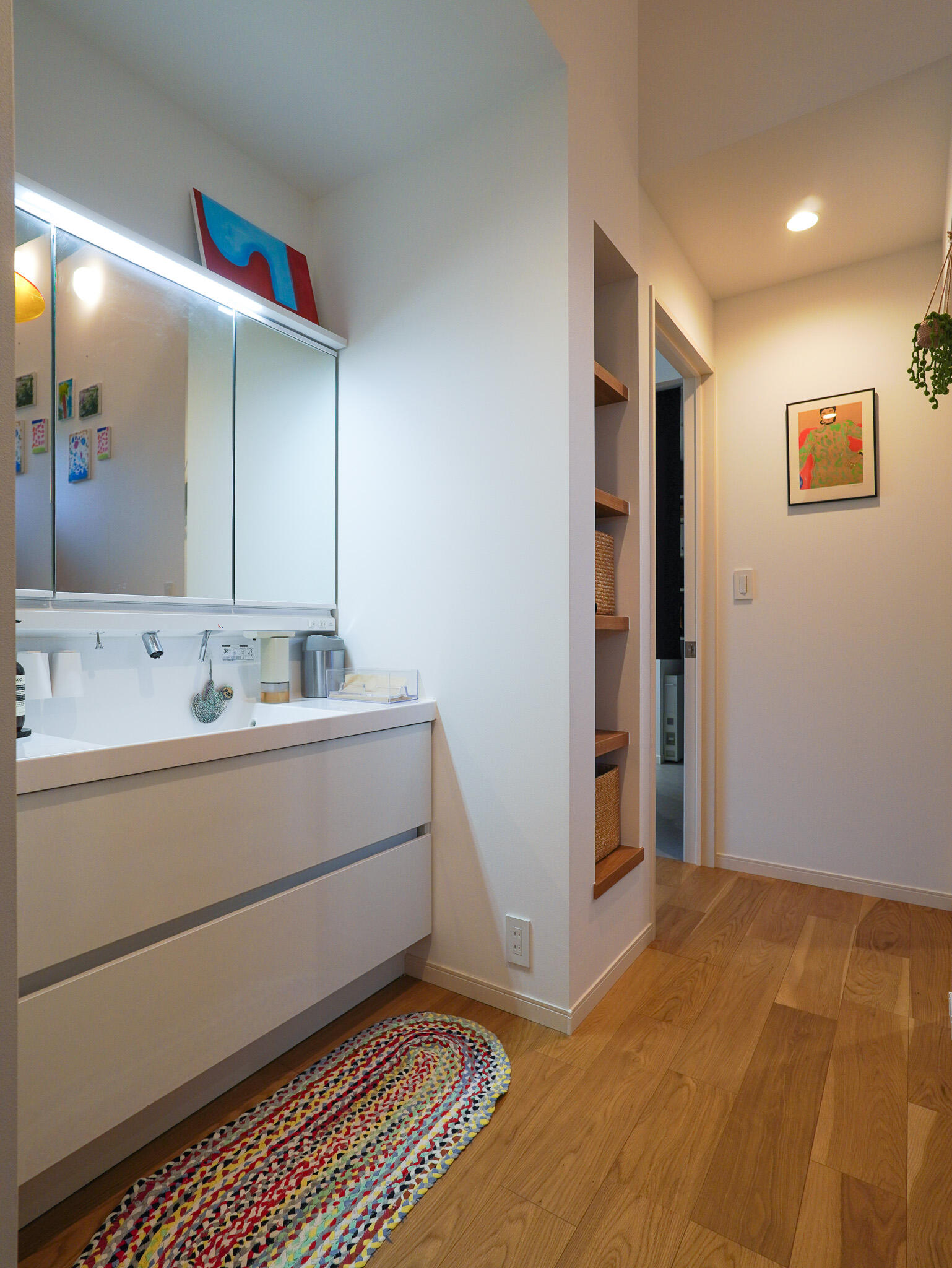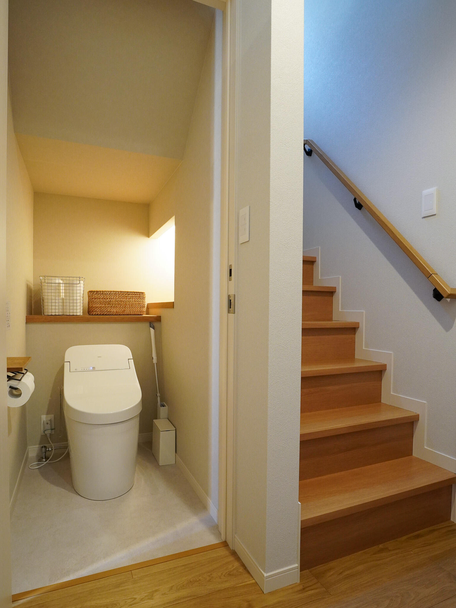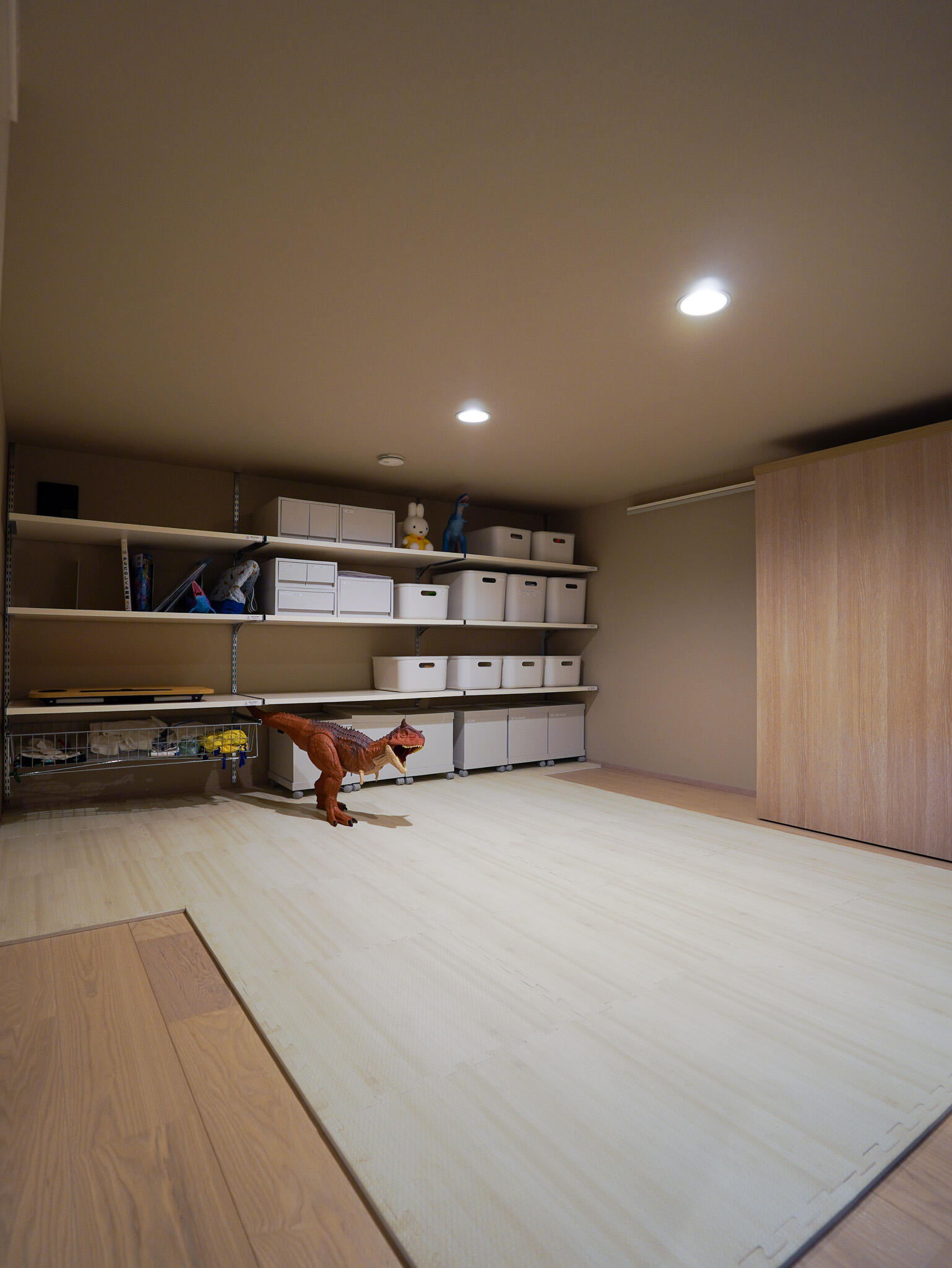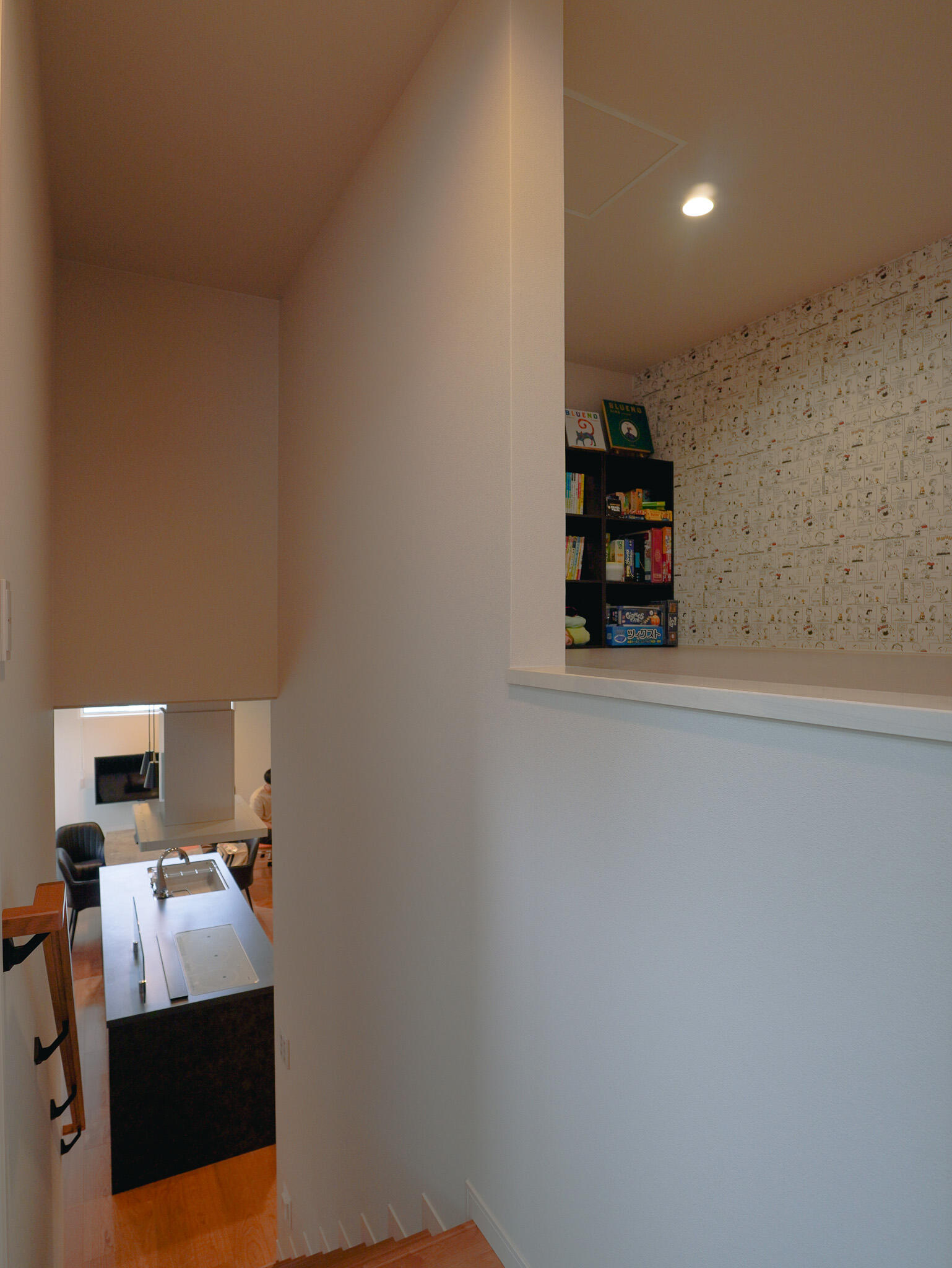 スキップフロアは、家族の気配を感じながらも程よくこもれる万能空間。下のリビングと視線がつながることで、子どもたちが遊ぶ姿も自然と見守ることができます。 蔵は、お子様が小さい間はおもちゃ収納として、将来的には思い出のものや趣味の道具をたっぷりと収納。 子育てにやさしく家族の成長に寄り添う、ぬくもりある住まいです。