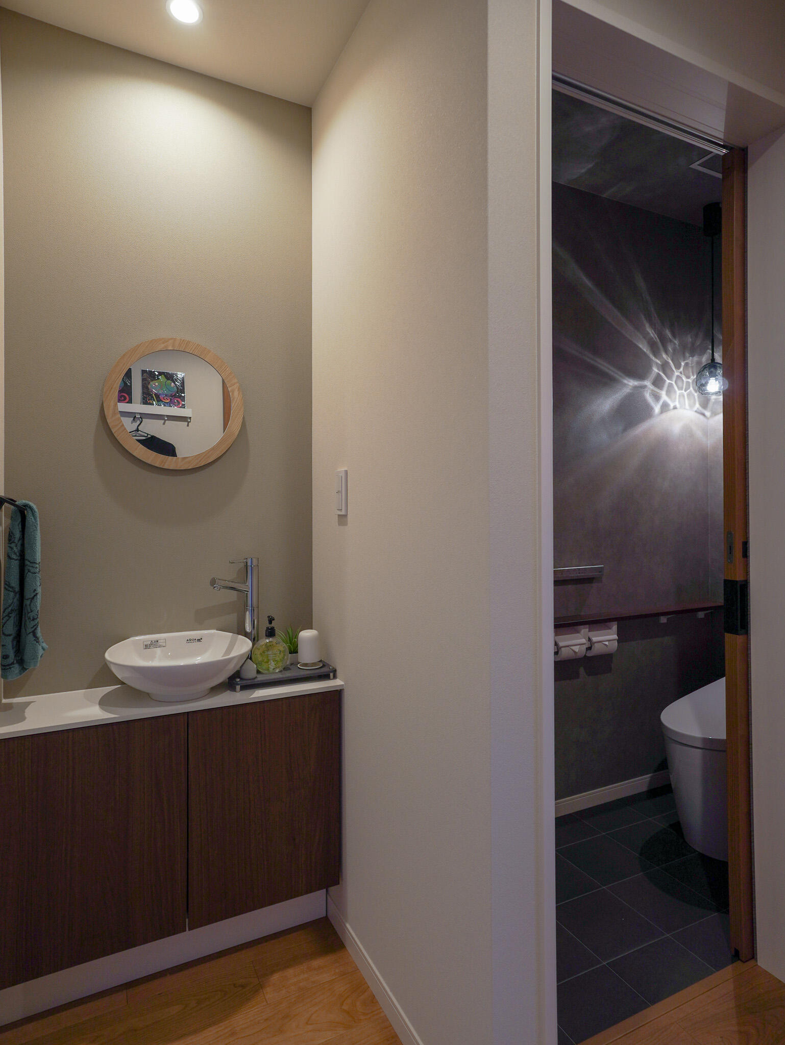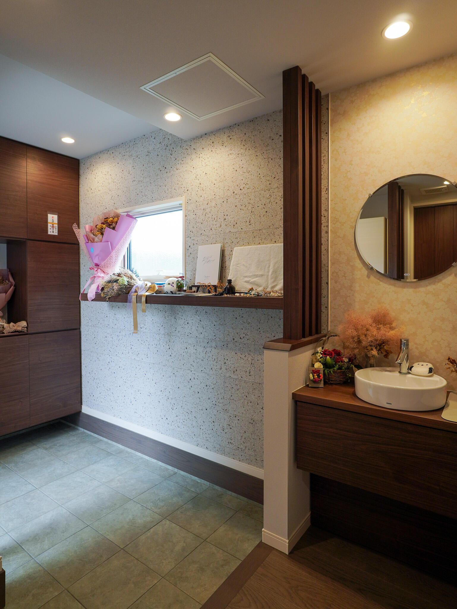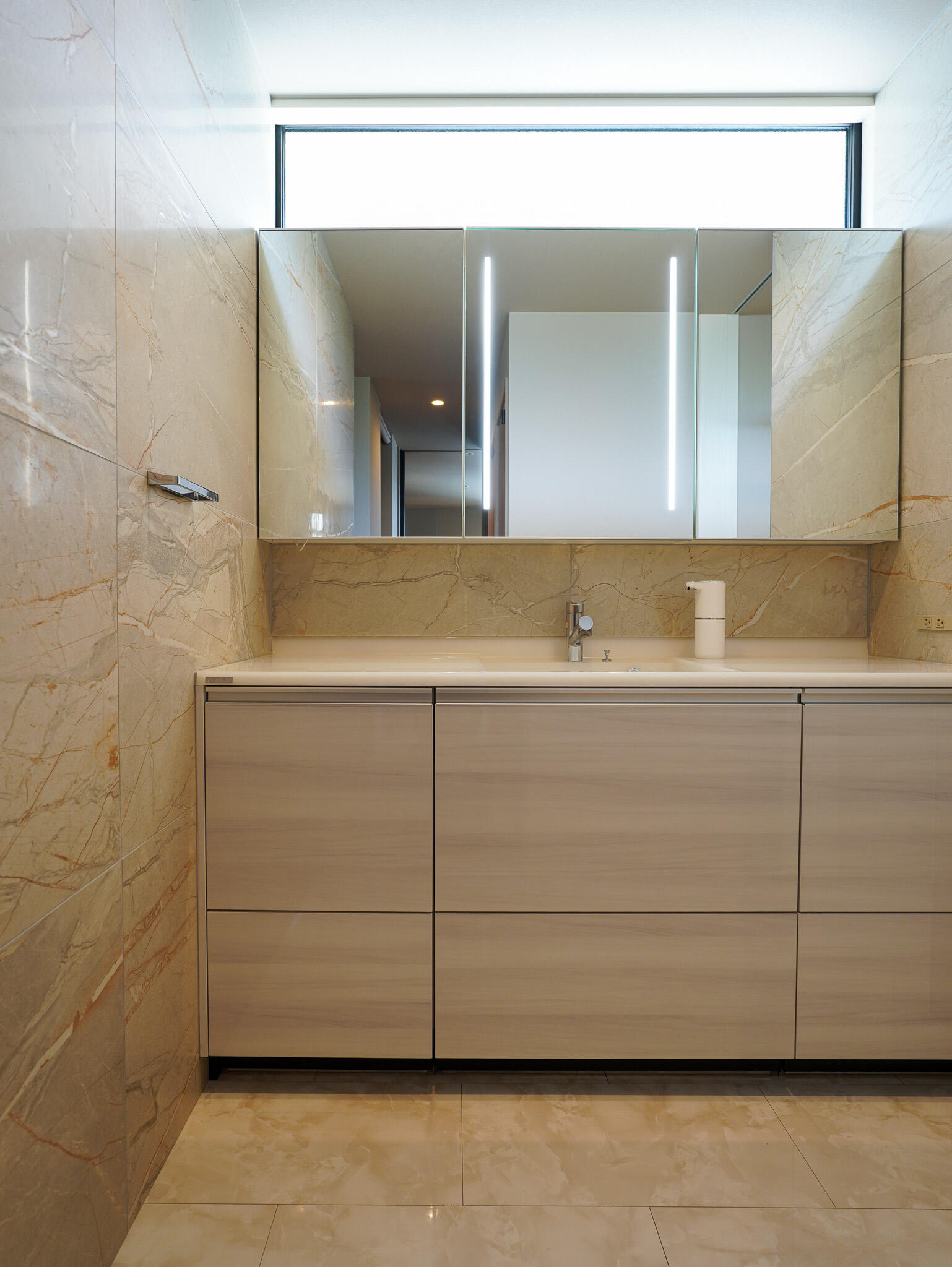 間接照明や大理石調フロアが、ホテルのような落ち着きと高級感を演出。 インテリアや動線にもこだわり、収納もたっぷりなので、見た目だけでなく暮らしやすさにも配慮された住まいです。