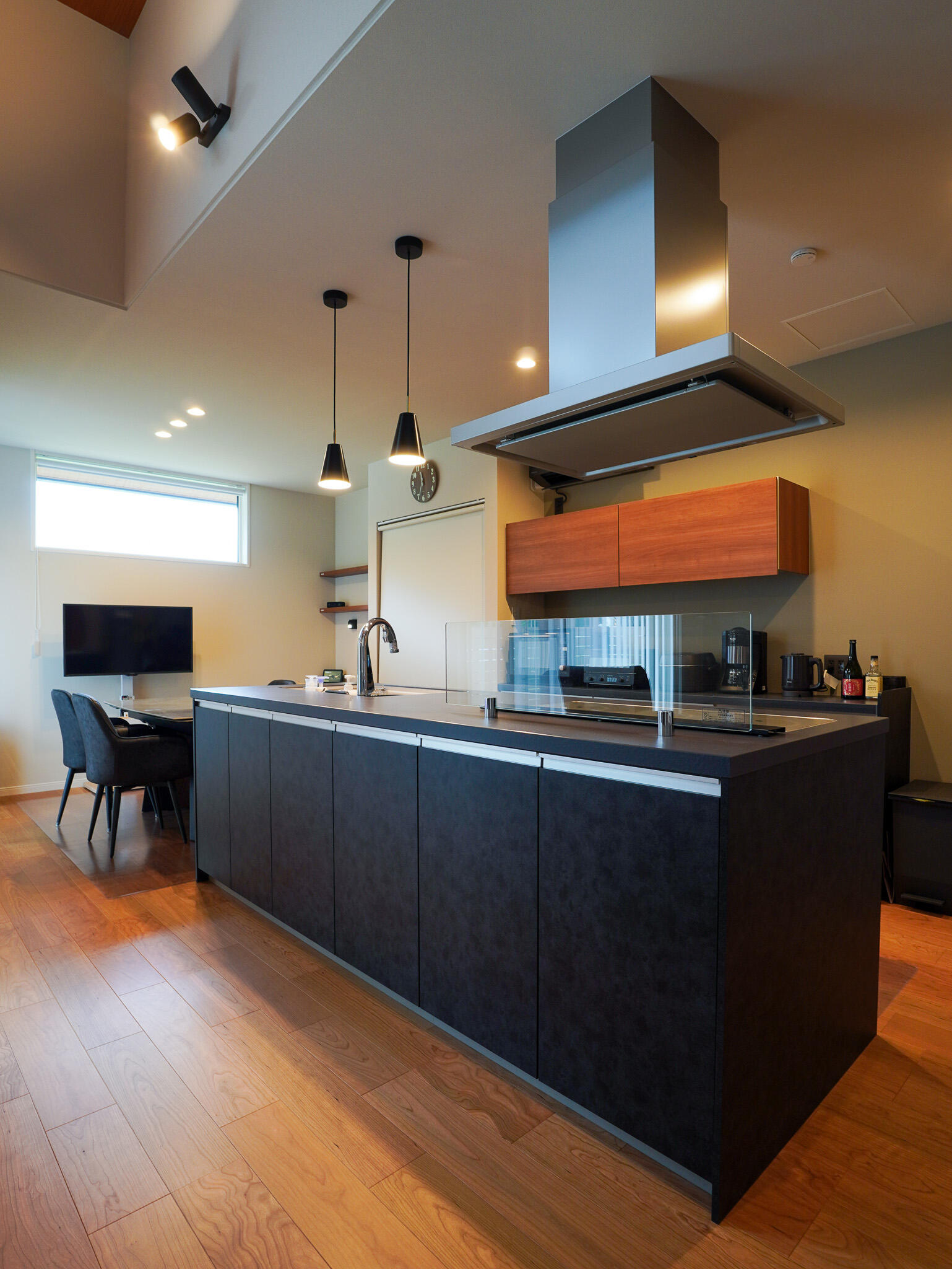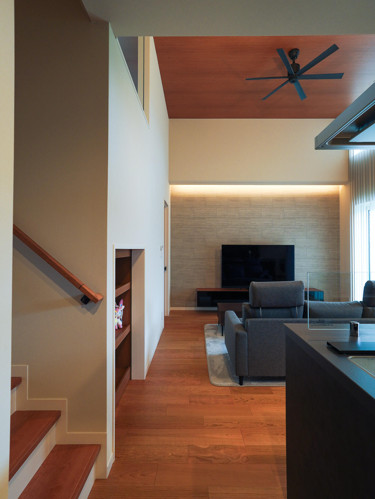 高天井ならではのお部屋の明るさや、空間にメリハリを生むスキップフロア。 洗練されたインテリアの中にも、家族のあたたかさを感じられる。 家事動線や収納、空間の使い方までしっかり設計された心地良い住まいです。