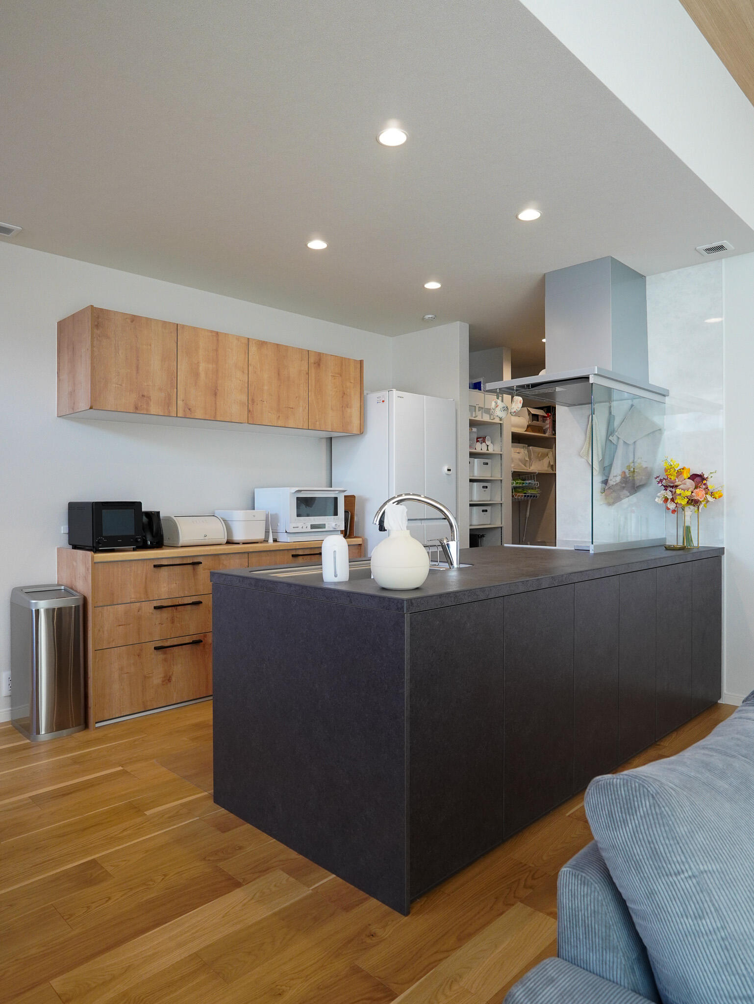 家事動線の評判が良いSMART STYLE「H」をオーナー様好みにカスタム。蔵とスキップフロアの開口を広く取ったり、冷蔵庫のサイズに合わせてカップボードを選択したり。自由度の高い企画住宅をオンリーワンにカスタムした開放感溢れるお住まいです。