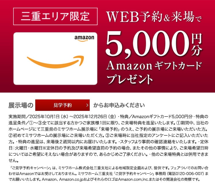 ・キャンペーン対象者:当ホームページのお近くの展示場「見学予約」から住宅展示場を来場予約の上、ご来場いただきアンケートにお答えいただいた方。ミサワホームの住宅展示場にはじめてご来場のお客様で、将来的に住まいづくりをお考えの方。 ※特典は、1 家族1 回とさせていただきます。