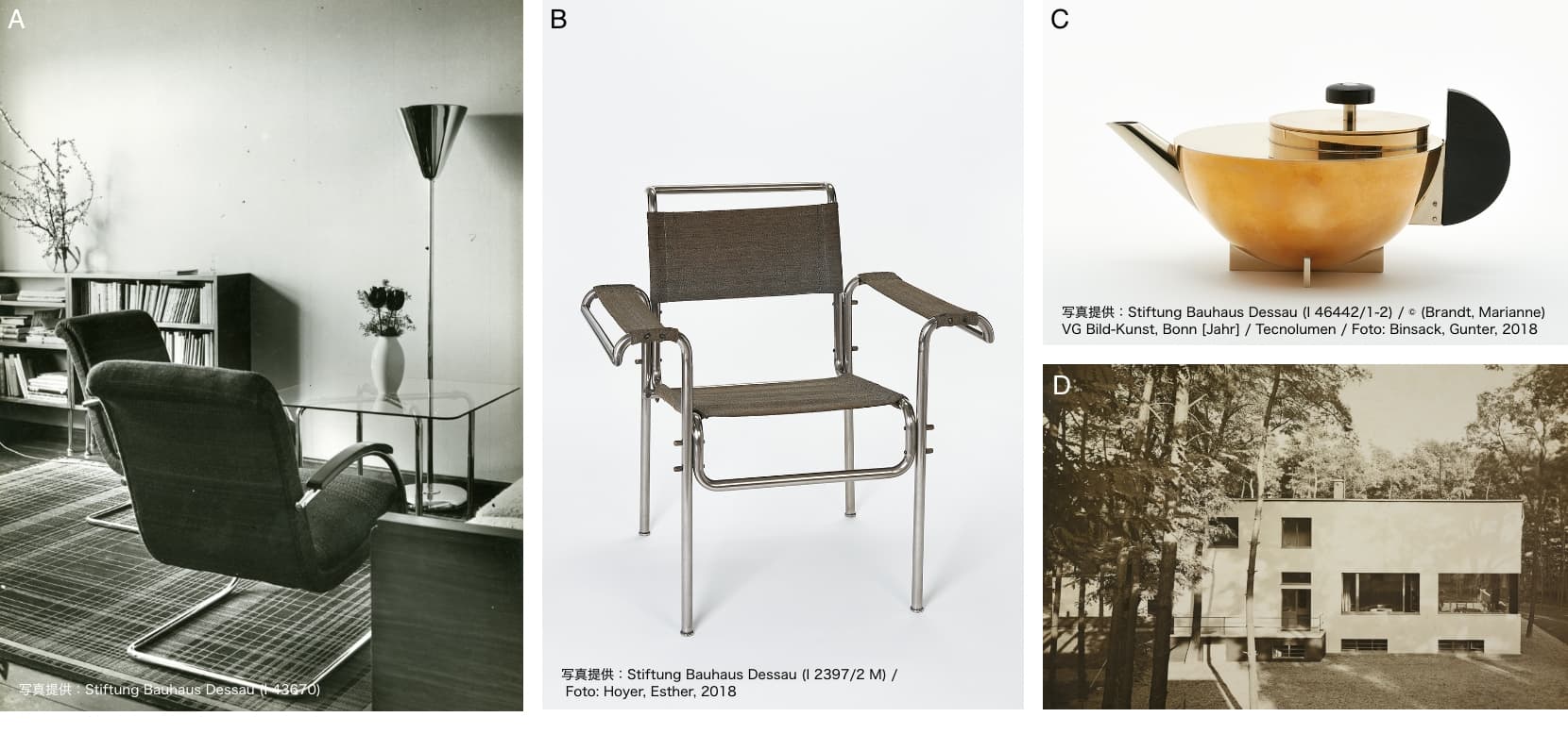 写真はマルセル・ブロイヤーがデザインした化粧台。なお、建物の中にあるインテリアや家具はバウハウスの家具工房、カーペットなどは織物工房、照明などは金属工房、台所用容器(キャニスター)は陶器工房がそれぞれ制作したもの。