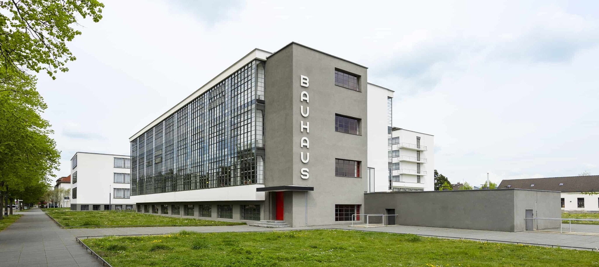- バウハウスがデッサウに建てた校舎は、世界の校舎建築の原型となった建物です。グロピウスのプランは左右非対称の構成、ガラスのカーテンウォール、道をまたがるブリッジなど近代建築の特長を備えた先進的なデザインで注目を集めました。この校舎を含むバウハウス関連建築物はユネスコの世界遺産に登録されています。