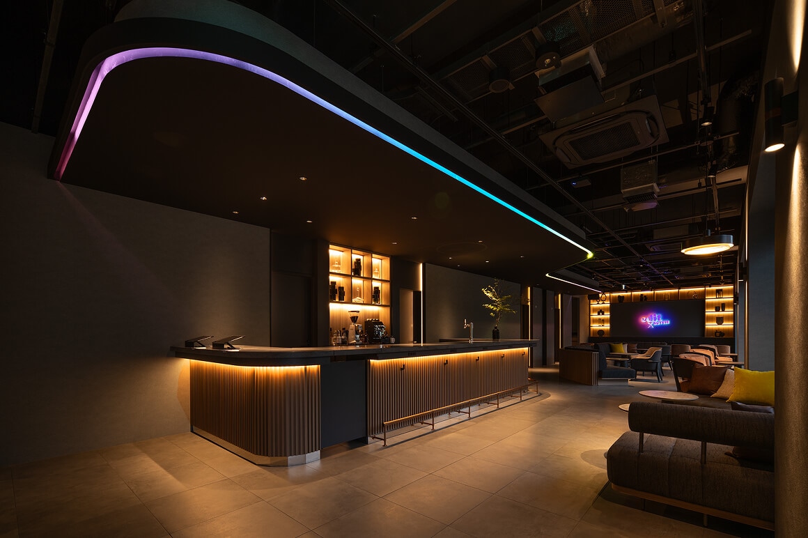 1階のエントランスにはバーカウンターを設置。飲食も楽しみながらゆったりとした時間を過ごすことができる。
