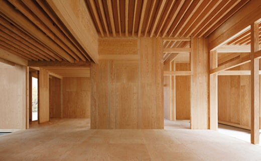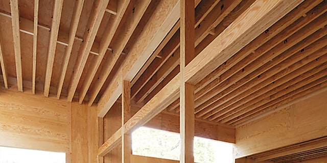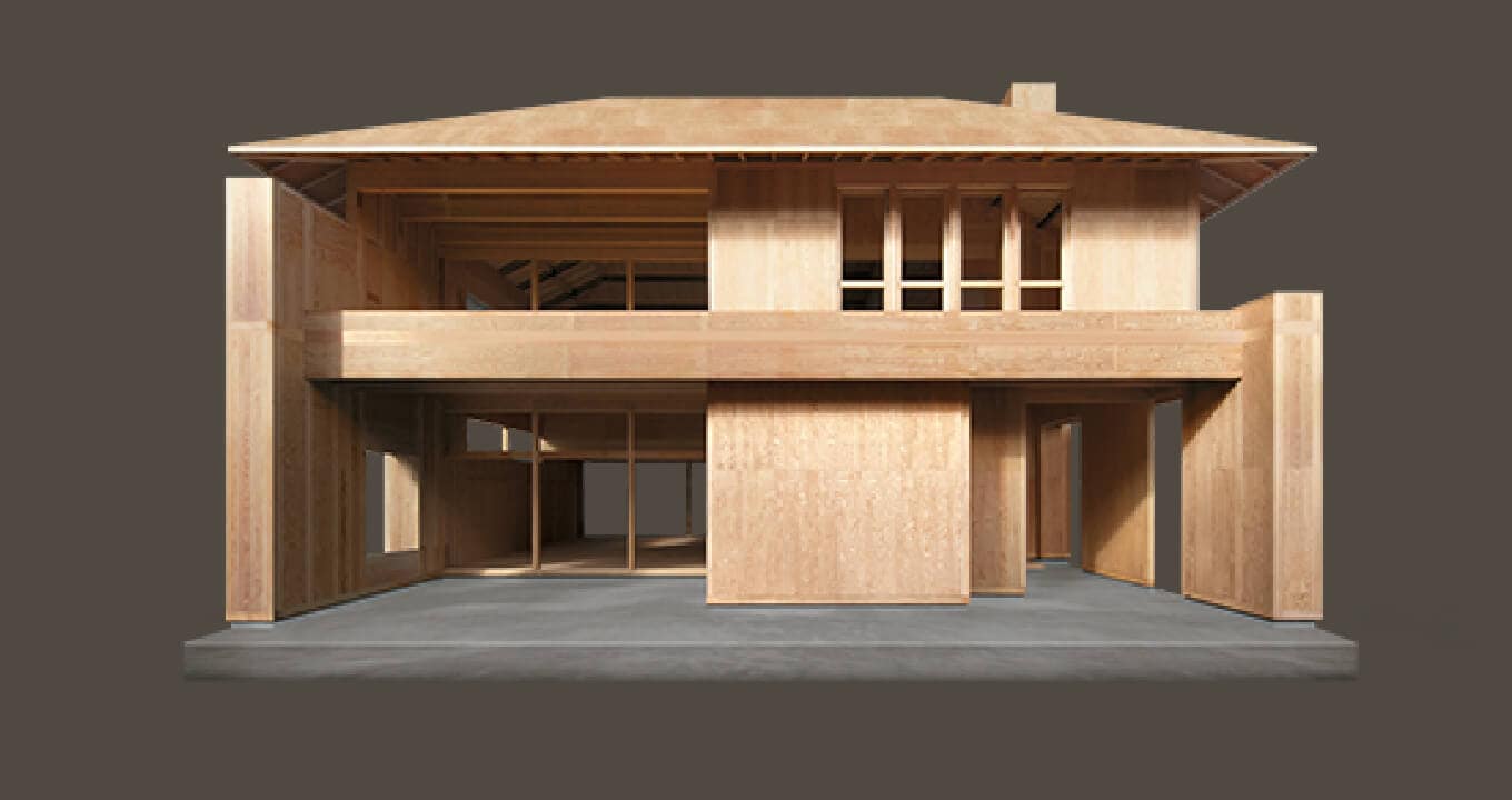 センチュリーモノコック構法。木質パネル同士を面接合して全体を一体化する、強固なモノコック構造です。