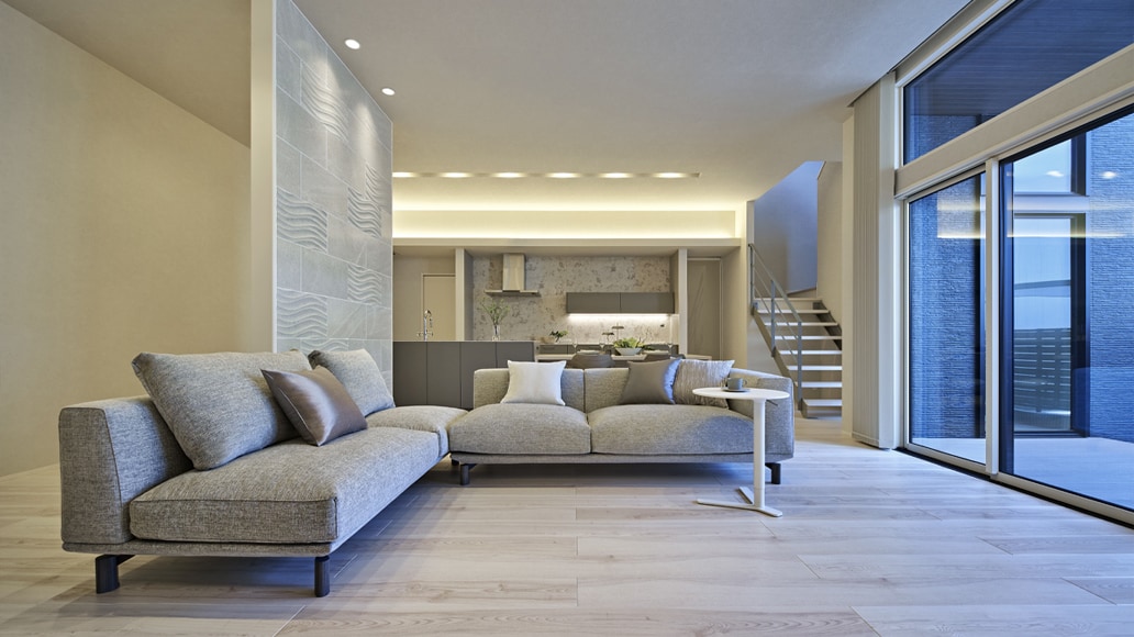 高天井のリビングで家族のふれあいを育む伸びやかな子育てと美しい生活を両立させた家