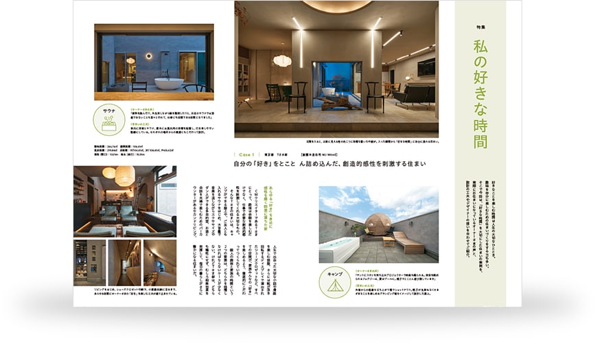 CMクリエイターのTさまにとって趣味は、余暇の楽しみであると同時に、仕事の創造性を高める大切な要素。 住まいには、屋上キャンプや友人と入れるサウナ、大音量で音楽を楽しめる多目的室、 夫婦で語らうバーカウンター付きのセカンドリビング、愛読書の部屋、演出性の高いシューズクロゼットなど、 「好き」を存分に楽しめる空間が広がる。 個人の趣味と家族の時間を両立させ、相乗効果で日常をより豊かにする住まいだ。