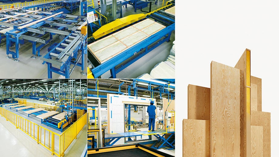 フィンランド材は日本国内のミサワホーム工場に輸送され、工場生産ならではの高い精度で木質パネルに加工される。骨組みと面材を接着接合によって一体化させて箱状の構造となる木質パネルは、どの方向から力がかかっても変形しにくい高い強度を実現。また、内部に断熱材をすき間なく充填できる構造によって、高い断熱性も獲得。木質パネルは断熱材の充填も工場の生産ラインで実施。人工乾燥で含水率を15%以下に抑えられた木材は、反りやひび割れに強く、設計通りの断熱性や耐震性の実現や、高い初期性能を将来にわたって維持する上でも貢献。