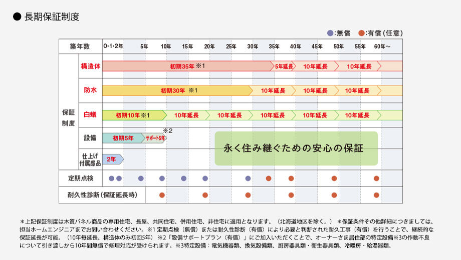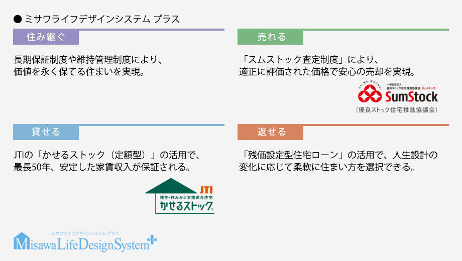 住まいの性能を長期にわたって維持し、末永く住み続けるためのメンテナンス計画や長期保証制度などの体制を完備。加えて、残価設定型住宅ローンの活用などで、人生設計の変化に合わせて住まいの柔軟な有効活用をサポートする「ミサワライフデザインシステム プラス」を用意。
