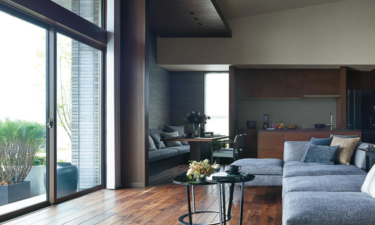 最高約4mの大きな勾配天井の「シーズンリビング」は、南面開口部に天井高いっぱいのハイサッシを採用。採光にもすぐれた大開口により、庭を連続空間のように利用でき、平屋の醍醐味である自然とのつながりが最大限に味わえる。