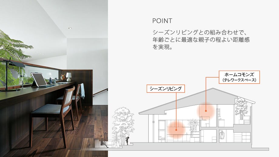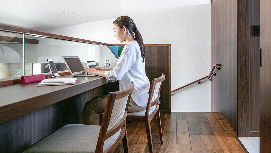 国が推奨する働き方改革や、コロナ禍における新しい生活様式の働き方として、今後ますます増加が予想される在宅ワーク。1.5階のホームコモンズは、そのためのワークスペースとしても最適だ。1階のシーズンリビングにいる子どもの気配を感じながらも、集中して仕事に取り組むことができる。
