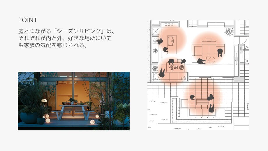 従来の平屋にはないこうした新しい提案の他、平屋ならではの魅力を最大限に味わえる点にも注目したい。見どころの一つは、2層スタイルだからこその高天井と、外の庭と深くつながることのできる南面大開口を備えた「シーズンリビング」だ。庭をリビングの延長となる「アウトドアリビング」として活用できるため、心地よい自然とのつながりとともに、家族の気配を程よく感じながら過ごすことができる。 シーズンリビングは大収納空間「蔵」も備えているので、たとえば七夕やクリスマスなど、子どもたちの季節のイベントなどで飾る大きなツリーなども、余裕で収納可能だ。ふだん使っているソファなどをそのまましまうこともできるから、広々としたシーズンリビングを最大限に使うことができ、子どもの友だちを呼んだお誕生会なども開きやすい。