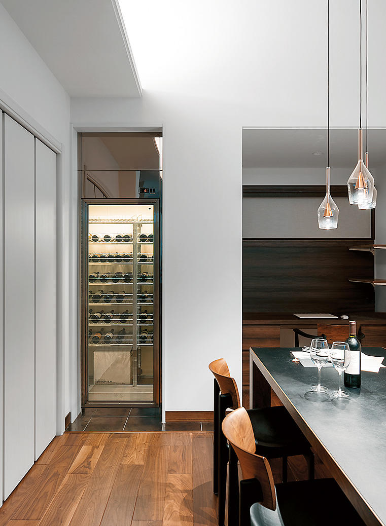 ワイングラスをイメージさせる7連の照明が印象的なダイニング。一角にPCカウンターも