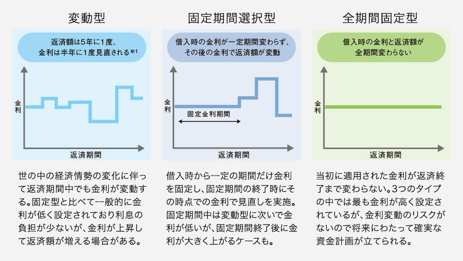 金利のタイプは大きく分けて3つある。金融情勢に伴って金利が変動する「変動型」、返済終了まで金利が変わらない「全期間固定型」、そして一定期間だけ金利を固定する「固定期間選択型」だ。一般的には変動型が最も金利が低いが、住宅ローンによって保証料や手数料などが異なるので、金利だけでなく、トータルで自分に合ったタイプを判断しよう。