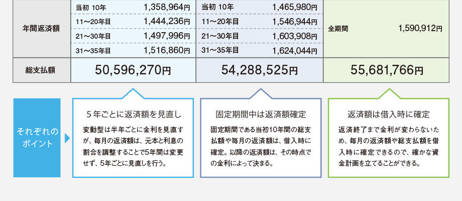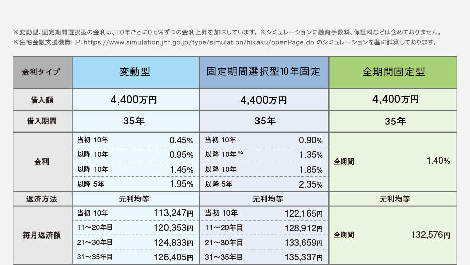 ※2 11年目からは変動金利を選択した場合を想定しています。11年目の変動金利の基準金利を「1.55%」と想定し金利上昇を加味した「2.05%」から、10年固定金利選択時の金利優遇(0.7%と仮定)を差し引き「1.35%」としています。以降、10年ごとに0.5%の 利上昇を加味した計算としています。