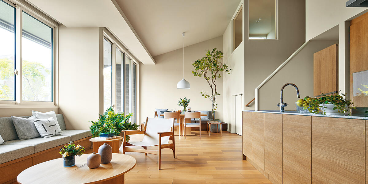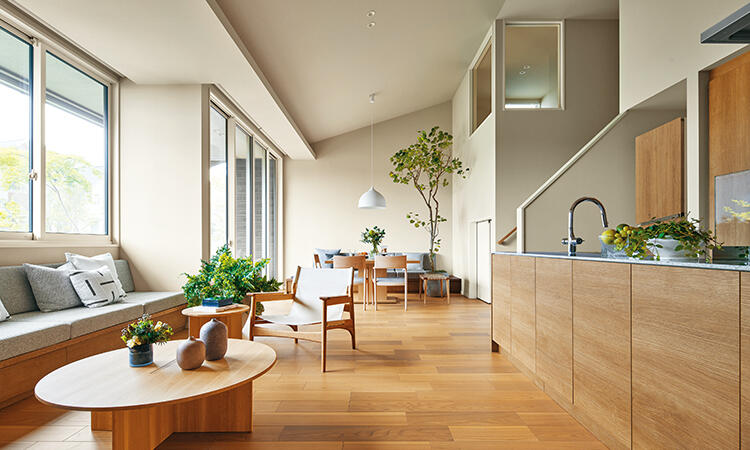「均質ではない空間をつくる秘訣のひとつと言えるのが、天井や床など、上下方向の高さに変化をつけることです」たとえば天井高なら、高いほど開放感が味わえ、低ければ落ち着いた気持ちになれる。高さにメリハリのある空間構成は、生活に心地よいリズムを生み、暮らしの愉しさのもとにもなる。「室内に〝抜け〟をつくることも重要な秘訣です。空間の間仕切り壁を減らして、建物の端から端まで一直線に見渡せる〝抜け〟をつくることで、空間が実際以上に広く感じられますし、風や光も抜け心地よさも高まります」このほか、〝たまり〟となる空間をつくることもおすすめだ。〝たまり〟とは、ヌックのような「こもり感」を味わえる空間のこと。「人という生き物は広い部屋にいると、拠りどころを求めて、無意識に壁際や隅の方へ寄ってしまうもの。〝たまり〟とは、そんな拠りどころになる場所です」もしも部屋の広さや数が同じ2つの間取りがあったとしても、このような空間の変化があるかないかで、心地よさや暮らし方は大きく変わる。間取りと空間構成は、切っても切れない関係だ。「住宅メーカーによっては、工法などの制限から実現が難しい場合もあります。設計の自由度が高く、耐震性能や断熱性能にもすぐれた住宅メーカーを選ぶことをおすすめします」