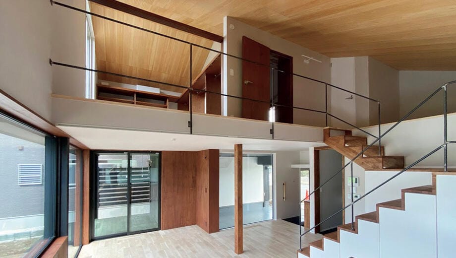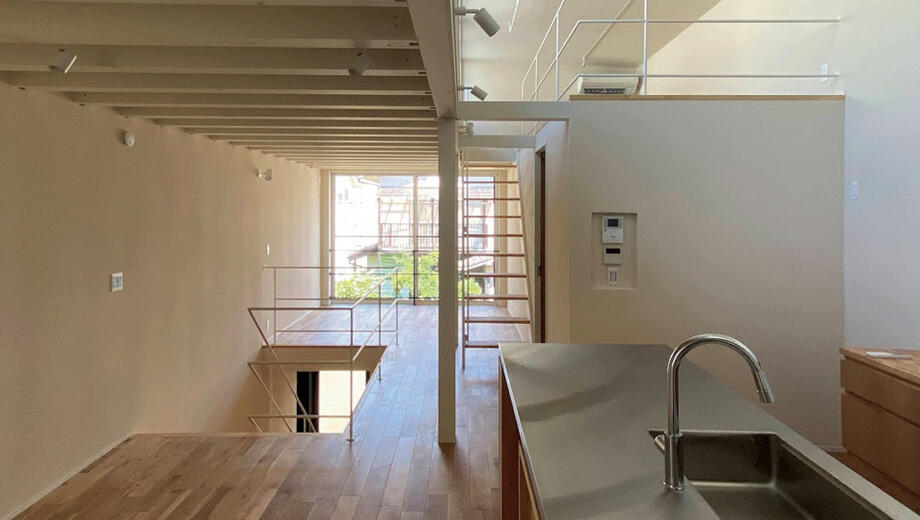 外の自然とのつながりを重視した住まいは、まちなみの美しさにも貢献する外観デザイン。天井はもちろん、スキップフロアなども巧みに活かしながら、上下方向の高さの変化がとても豊かな空間構成を実現。抜けのある空間は、開放感も抜群だ。