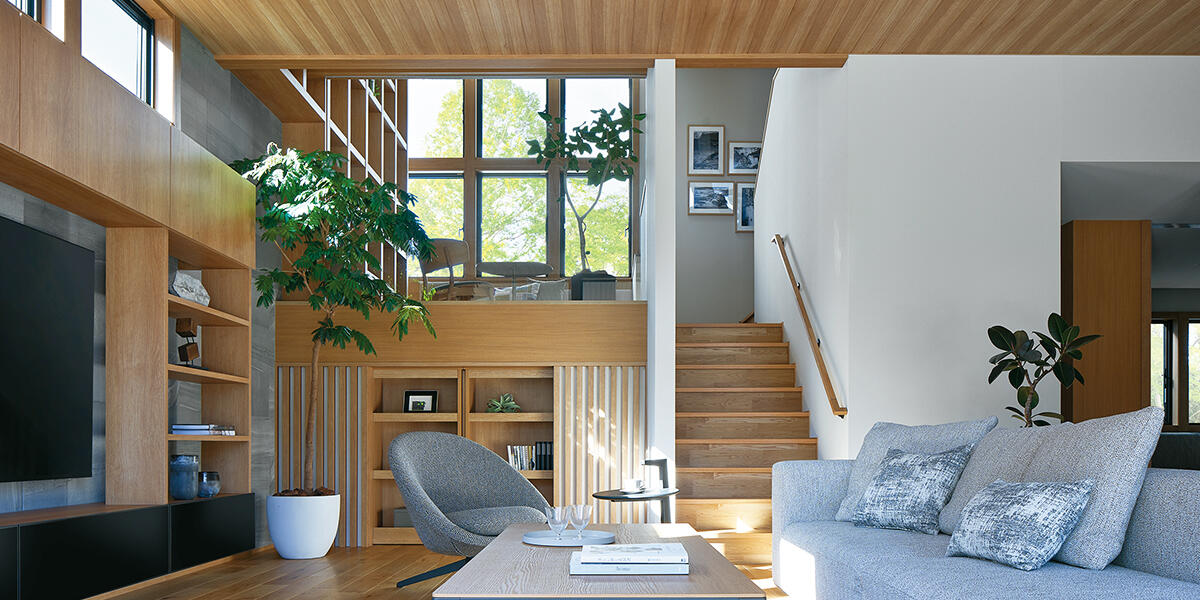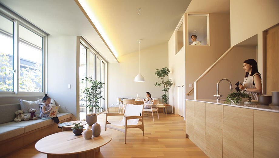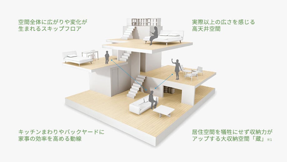 ミサワホームは、そんな垂直方向の工夫を得意としている住宅メーカーだ。ひとつは「高天井」。強靭なモノコック構造となる木質パネル接着工法は、高い耐震性能や断熱性能を維持したまま、高天井の大空間をデザインできる。強い構造体は設計の自由度も高いため、大収納空間「蔵」を好きなフロアに設けたり、「蔵」の上の0.5階分高いフロアを活用して、「スキップフロア」をデザインしたりすることも可能だ。高天井は、空間を実際以上に広く感じさせ、天井までヨコ桟のない「大開口サッシ」は、心地よさや開放感をアップさせる。また、複数の空間が立体的にゆるやかにつながるスキップフロアは、空間全体の広がりを際立たせ、より〝 抜け〟のある空間構成を実現。さらには、隣り合った空間にいる家族同士の程よい距離感を生み出すなど、家族のつながりを育むことにも貢献する。機能性や利便性を高めるゾーニングと、心地よさを高める垂直方向の工夫を合わせることで、間取りは一段と魅力的になるはずだ。