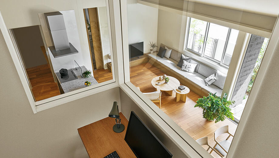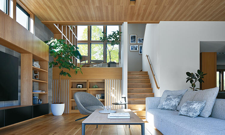 スキップフロアとは、フロアを0.5階刻みで配置するデザインのこと。ひとつひとつの空間が独立しながらも、空間全体がゆるやかにつながり、家族のコミュニケーションを育める。