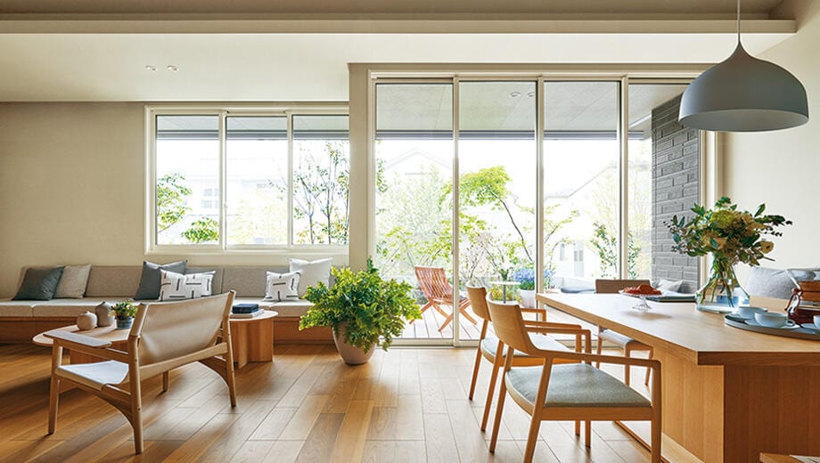 強靭な構造体ゆえに、高い耐震性を維持しながら、高天井の大空間が実現。開放感がアップする高天井の空間は、天井いっぱいのハイサッシを組み合わせることも可能で、採光も向上。