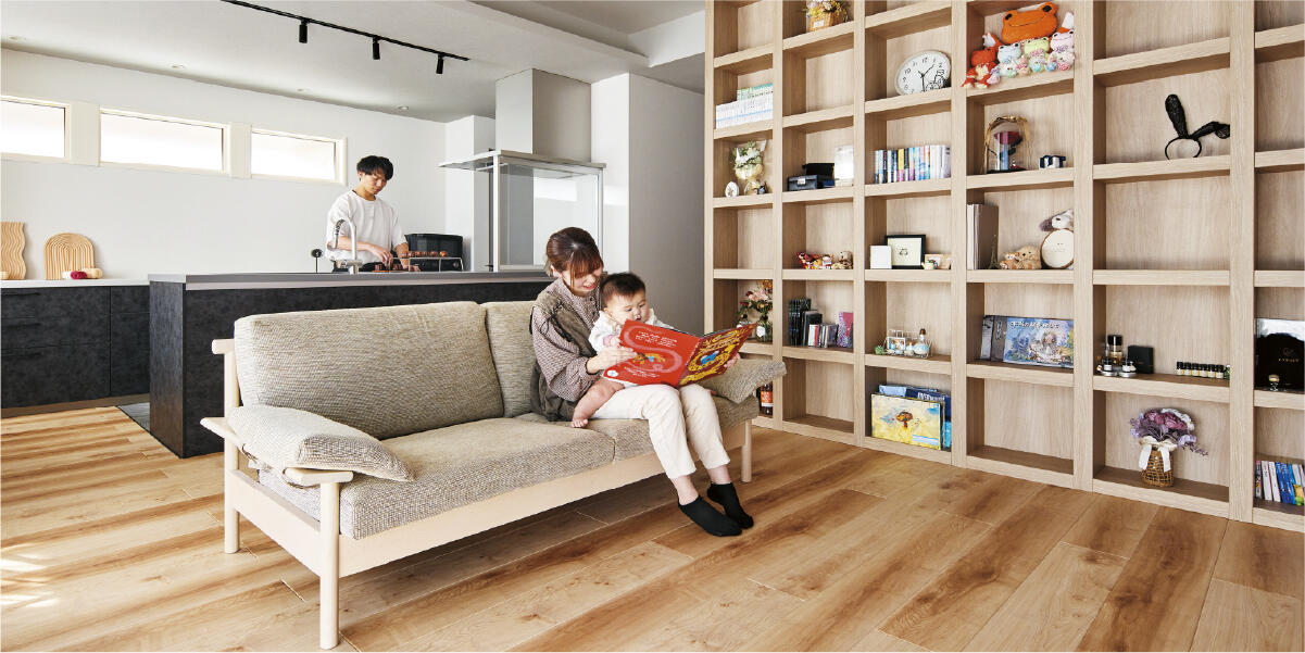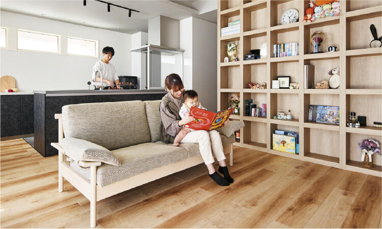 吹き抜けの階段にそびえる約4mの本棚。そこに並ぶコミックは読書好きな奥さまの宝物。幼い頃から集めてきた蔵書は1,000冊以上。さらにリビングにも天井までの飾り棚を造り付け、こちらにはお気に入りの絵本や小物が飾られている。子育ての合間に、階段に腰かけて本が読めるよう設計されているのも特長だ。一方、夫のYさまは中学生の頃からお菓子づくりが趣味。キッチンは使いやすいⅡ型配置にし、背面に作業スペースが十分にとれるロングカウンターのカップボードとパントリーを設けて、たくさんの調理道具をすっきりと収納。「休日はカヌレやタルトを焼いて、コーヒーと一緒に味わっています」とYさま。焼きたてのお菓子の香りが漂い、ページをめくる音がやさしく響く。そんな心豊かな暮らしを20代で叶えられたご夫妻。本棚やキッチンなどお互いの趣味を尊重しながらも、ほどよい距離感で暮らせる工夫が随所に盛り込まれた温かい住まいだ。
