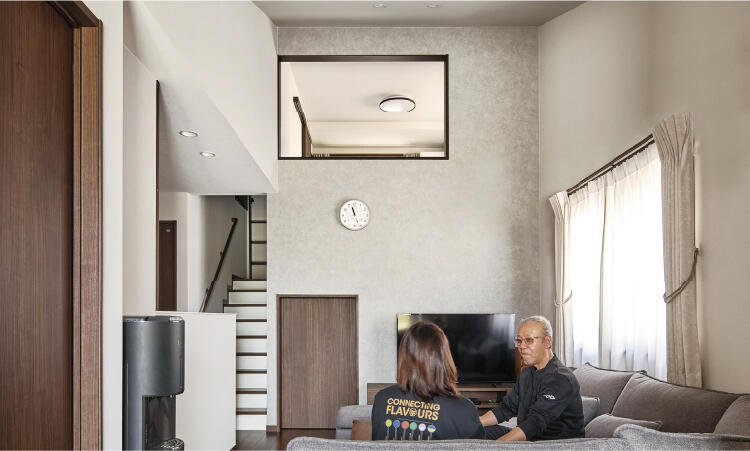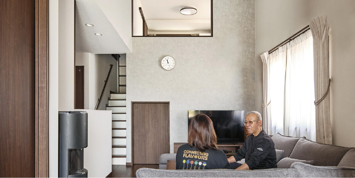 Fさま邸は120㎜厚の木質パネルによる、より強固な構造体で高い耐震性と断熱性を実現。「蔵」には、水や食料品などの備蓄品も収納。「命を守るには住まいが強いことが最優先。これで在宅避難ができます」とご主人。災害時にも貯湯水を生活用水として利用できるエコキュートも備えた。「入居以来、断熱性と気密性の高さに驚いています。夏もエアコン1台で冷房が賄えています」と奥さま。災害への備えについては、「やはり『水』ですね。最低でも1週間分は欲しい。石油ストーブも2台購入しました。発電機も検討中です」とのこと。まだ余震はありますが、震度3程度なら「少し揺れたかな?」としか感じないそう。住まいが日常と災害時の2つの安心を提供している。