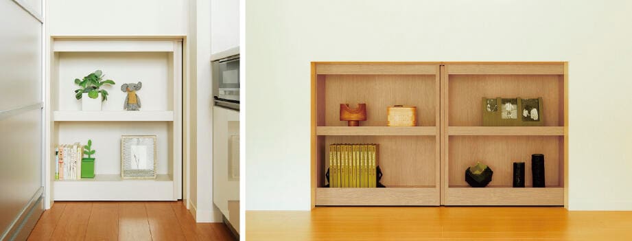 「蔵」出入り口の引戸に飾り棚の機能をプラス。「蔵」の内部が来客に見えないようにでき、写真などを飾ったり、小物をディスプレイすることもできる。引戸用の床レールが不要なので、「蔵」からキャスター付きのモノを出すときもスムーズ。