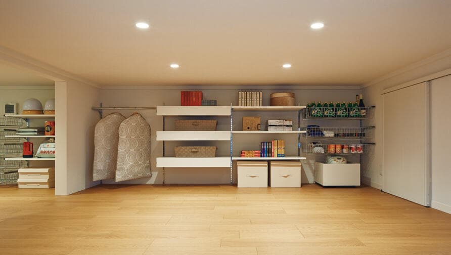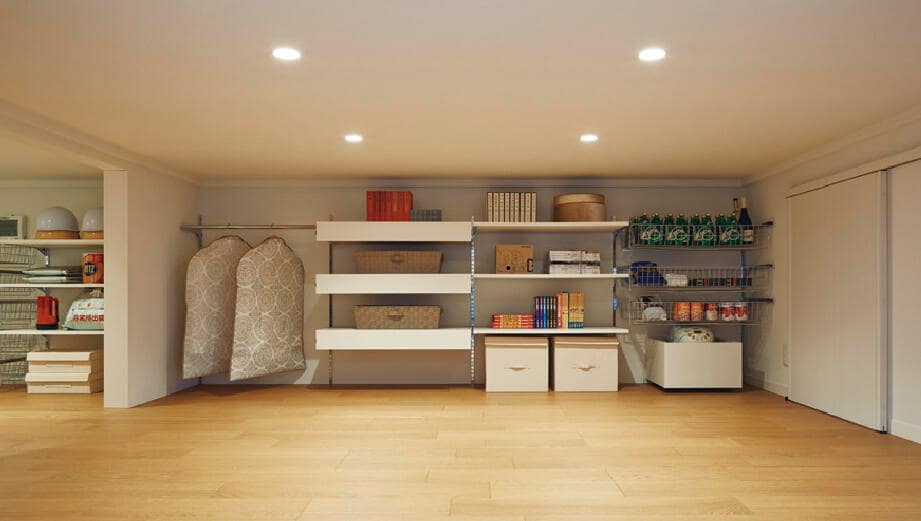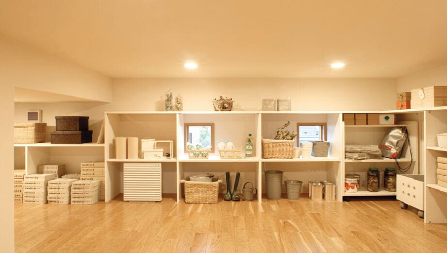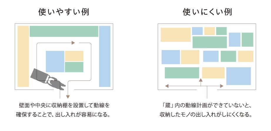 大収納空間「蔵」は、たくさんの荷物を収納できるメリットがある一方、無雑作に入れてしまうと、奥にしまったモノが出し入れしづらくなり、せっかくの収納力を使い切れなくなる恐れがある。上手に使いこなすコツのひとつは、出し入れする際の動線を確保できるよう、棚などを置いて空間を間仕切っておくことだ。
