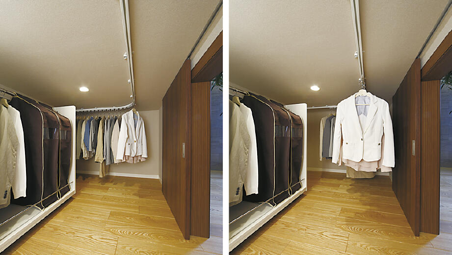 ボタン操作で動かせるハンガー。「蔵」の内部に入らなくても、奥に収納した衣類を「蔵」の開口部に移動させて取り出すことができる。