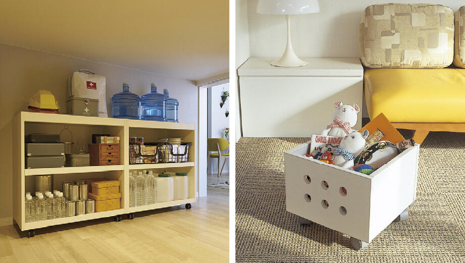 キャスターが付いているので、天井が低い空間でも、モノを移動させやすい。重量のあるモノを移動するときも便利だ。