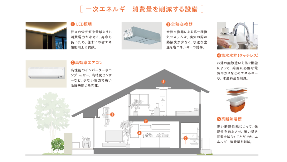 住まいの「一次エネルギー」とは、家庭で使用する電気やガスのもととなる原油や天然ガス、石炭などのこと。エネルギーが使用される機器には、冷暖房や給湯、照明などが挙げられる。「GX志向型住宅」では、これらの機器について効率と省エネ性の高さが求められる。