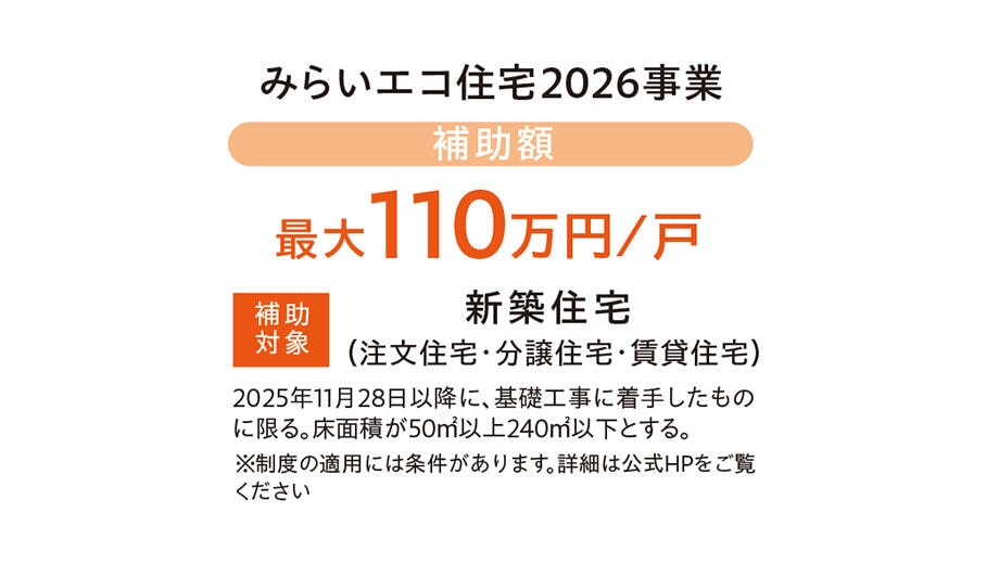 「GXZEH」は2027年に運用開始予定だが、その基準に準じた「GX志向型住宅」について、国の補助金制度がすでに始まっている。2026年は最大110万円の補助金額を設定。ただし、予算の上限に達した時点で締め切りとなるので、タイミングに気を付けたい。