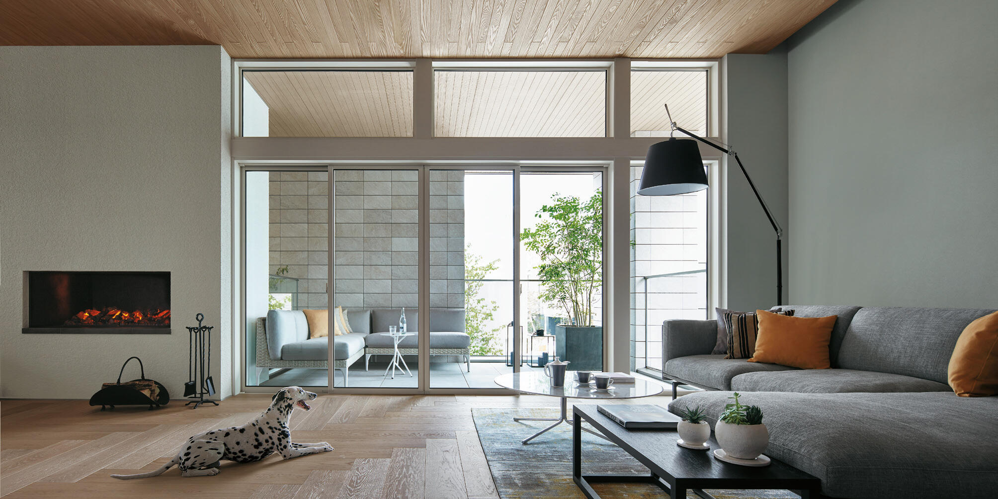 大開口・大空間でもGX志向型住宅の基準をクリアできるミサワホームの住まい。一般的な住宅メーカーでは、天井の最大高は2.7m程度で、3mを実現できても床の高さを下げるなどの工事が必要というケースがあるが、ミサワホームなら3m以上の高天井に、天井高いっぱいのハイサッシを備えた開放的な大空間が可能だ。