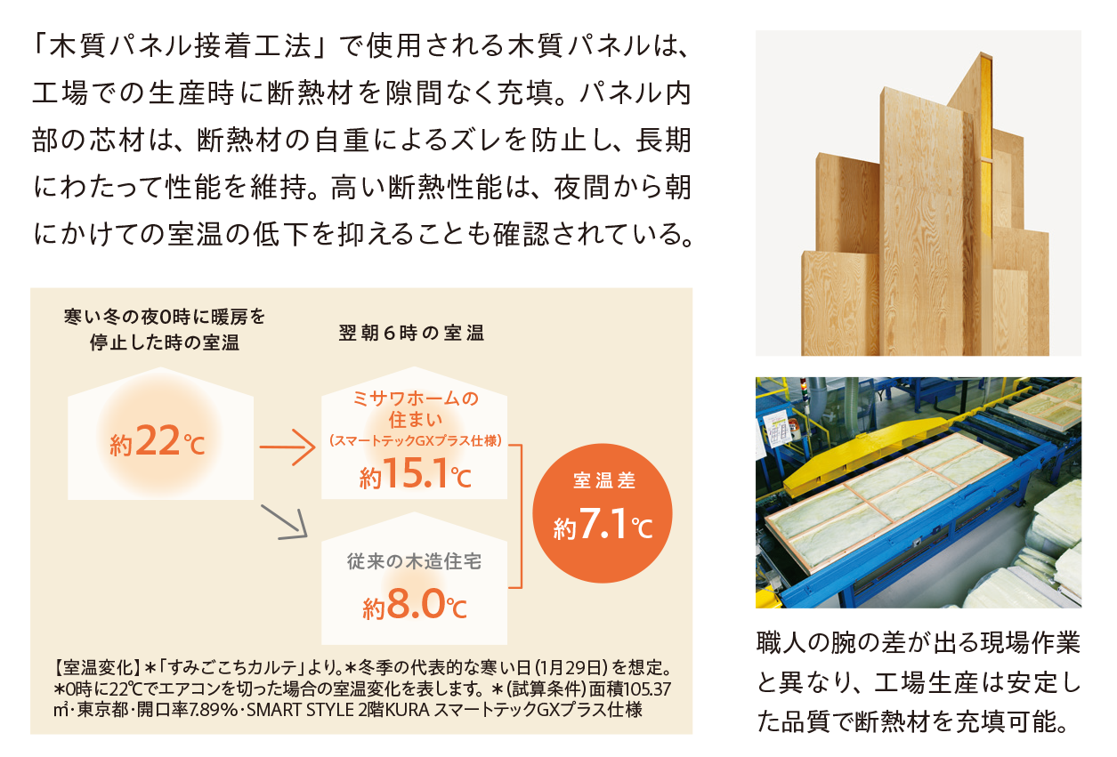 「木質パネル接着工法」で使用される木質パネルは、工場での生産時に断熱材を隙間なく充填。パネル内部の芯材は、断熱材の自重によるズレを防止し、長期にわたって性能を維持。高い断熱性能は、夜間から朝にかけての室温の低下を抑えることも確認されている。