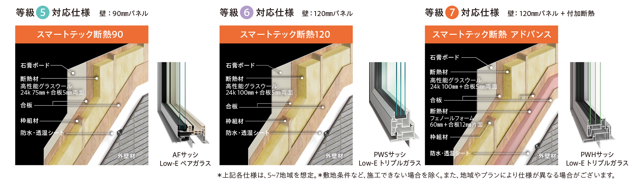南北に長い日本は、地域による寒暖差も大きく、同じ断熱等級でも、地域によって求められる基準値が異なってくる。ミサワホームでは地域の基準に合わせた断熱仕様の提供が可能。断熱等級を5~7までのバリエーションから選択が可能。さらに「SMARTSTYLE Roomie」などの企画住宅も断熱等級6を標準化にしている。