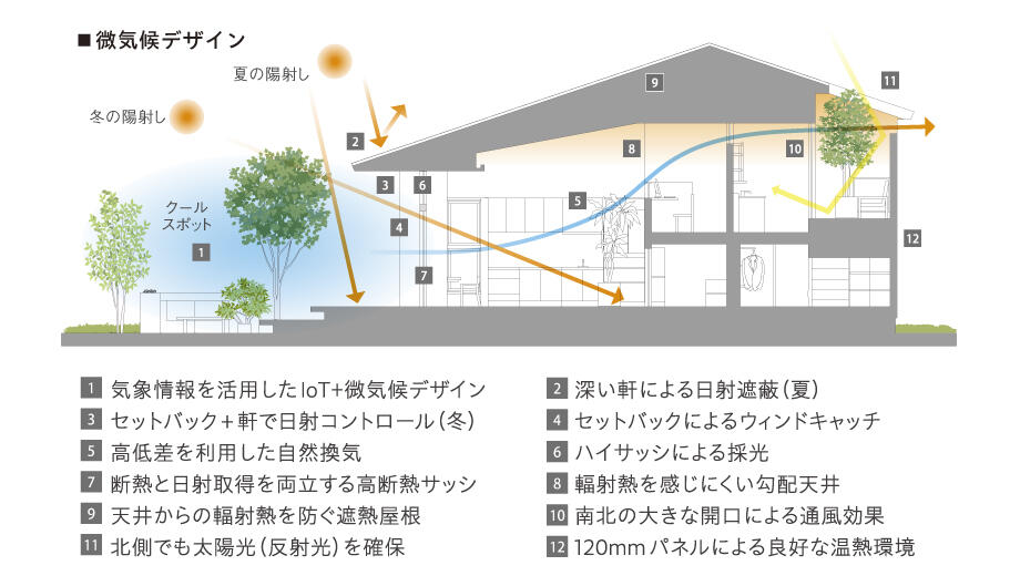 高断熱・高気密で高い快適性を実現した住まいでも、ときには窓を開けて心地よい風を感じたくなるはずだ。ミサワホームでは、自然の心地よさを積極的に活用する独自のデザイン手法「微気候デザイン」を採用。窓を開けたときの通風や採光の心地よさが向上するほか、エアコンを使用しない「中間期」の暮らしを、より快適にすることが可能。