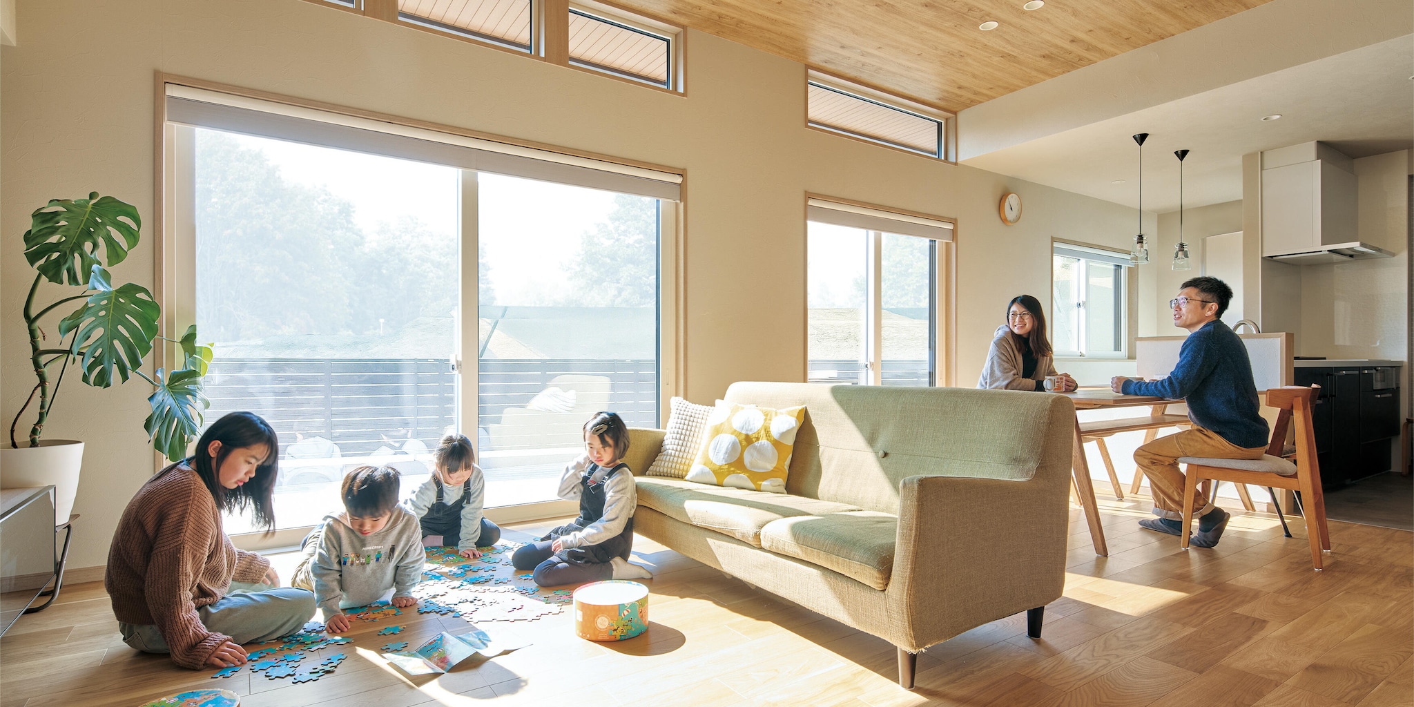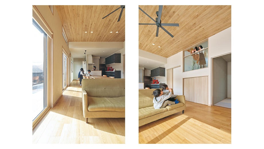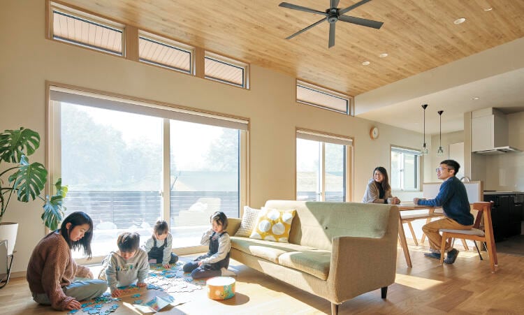 4人の子どもの部屋を確保して、暖かい家にしたいとのご希望が、住まいづくりのきっかけだったというKさま。完成した新居は、高天井&大開口リビングなどを設けながら、GX志向型住宅の基準を満たす、すぐれた断熱性能を実現。「以前の家が寒かったので、断熱性能の数値が高い複数の住宅メーカーを検討しました。当初は鉄骨系の家がよいと考えていたのですが、高効率の冷暖房機器などに頼るウエイトが高い印象を受けました。機器が故障したら暖かさが失われ、修理代もかかります。対してミサワホームの住まいは、構造体そのものの断熱性能が高く、機器に頼るウエイトが小さいと感じ、これが選んだ決め手のひとつになりました」完成した住まいの断熱性能は、想像以上に高かったと語るKさま。「以前の家は、窓際が寒くて、空間全体を有効に使えていませんでした。この住まいは部屋のどこにいても室温が一定です。夜から朝にかけて室温が低下する度合いも、あきらかに小さいですね。ストレスなくおだやかに暮らせます」