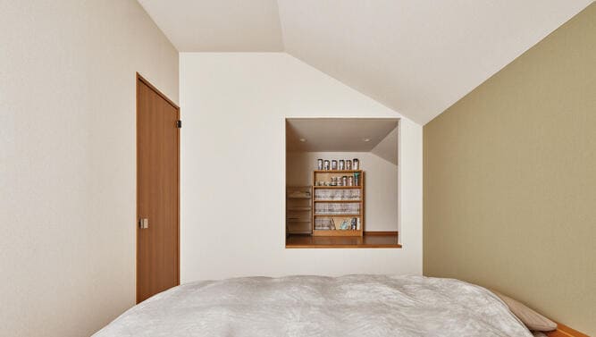 LDKには、大収納空間「蔵」と、蔵上の1.5階にお子さまの遊び場となるマルチルームを設計。構造体の断熱性能が高いため、これほど広いLDK空間の全体が、たった1台のエアコンで快適な室温に。2階のご夫婦の寝室にはロフトを設け、趣味のコミックなどを収納している。