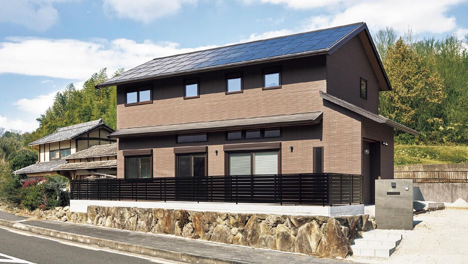 屋根建材一体型の太陽光発電パネルを搭載した住まいは、美しい外観も実現。