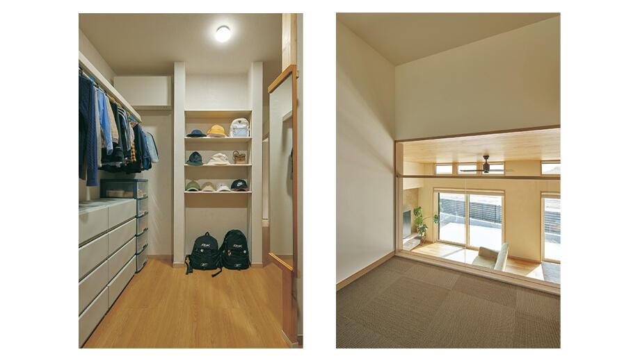高断熱による快適性は、奥さまも日々実感されているそう。「冬場のキッチンで炊事をしていても、足元が冷えないんです。家事がとても楽になりました」120ミリ厚の木質パネルで構成された「木質パネル接着工法」の住まいは、断熱性能とともに耐震性能もすぐれており、多様な空間設計ができることも特長。このメリットを活かし、Kさま邸では2つの大収納空間「蔵」® ※や、1・5階のスキップフロアもデザイン。「スキップフロアは子どもが遊ぶスペースとして使っています。リビングにいる親からも姿が見えるので、とても安心です」住まいづくりでは、お子さまが自立心を育めることも重視。「蔵」や2階のファミリークロゼットは、親の手を借りずに片付ける習慣をお子さまに付けさせたいという想いから設けたもの。その他、洗濯をはじめ効率的な家事動線や、静かな在宅ワークスペースの確保など、希望をすべて叶えた住まいで、快適な暮らしを楽しまれている。