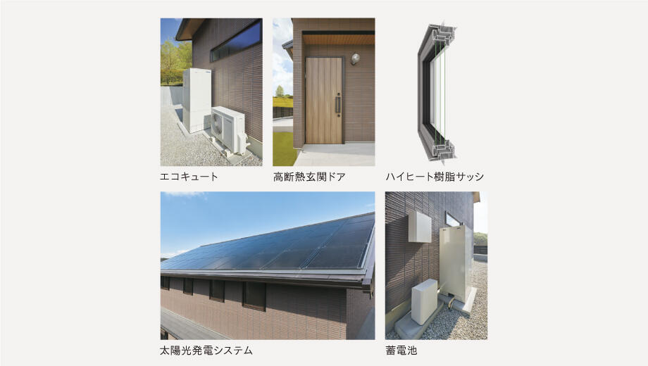 Kさま邸では、120mm厚の「木質パネル接着工法」の構造体をベースに、8.32kWの大容量太陽光発電システムや、国内最高クラスの断熱性能を実現するハイヒート樹脂サッシ、高断熱玄関ドア、蓄電池、エコキュートなどの創エネ・省エネアイテムを採用。