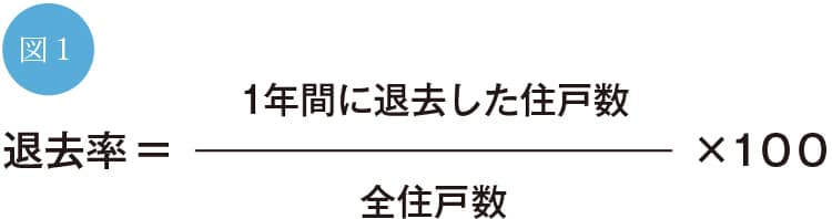 算出方法は、退居部屋数の合計を全体の部屋数で割り、100分率にして計算されます(図1)。例えば、住戸が100戸ある集合住宅で、1年間で10戸が退去した場合、退去率は10%となります。