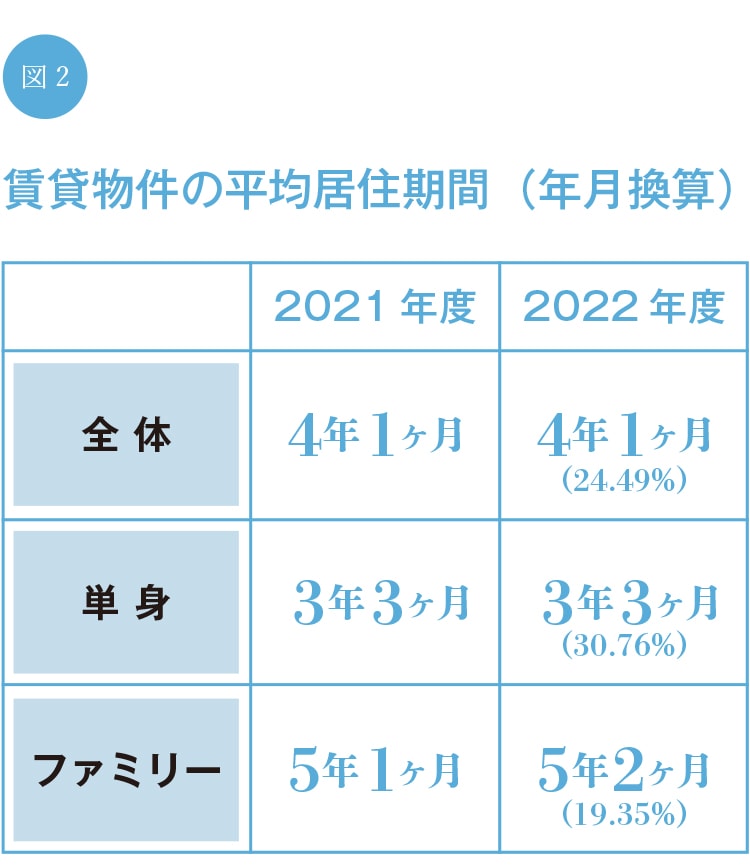 公益財団法人日本賃貸住宅管理協会日管協総合研究所の「第27回 賃貸住宅市場景況感調査『日管協短観』」内の「賃貸物件の平均居住期間」(図2)によると、全国では、単身の平均居住期間が約3年、ファミリーが約5年となっています。両者を含めた全体の平均居住期間は約4年1ヶ月で、一般的に独身世帯の方がファミリー世帯より平均居住期間は短い傾向にあります。